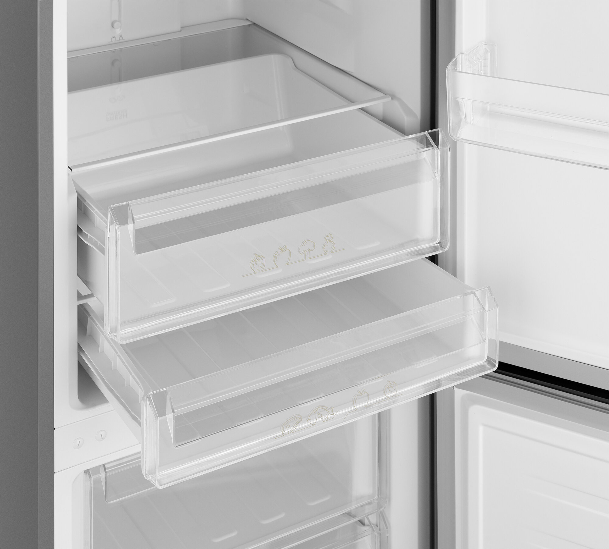 Поверхность дверей - стекло. Цифровой дисплей на двери и сенсорное управление. Удобный размер ящиков в морозильной камере. Яркая подсветка. Удобные ящики для овощей и фруктов. |