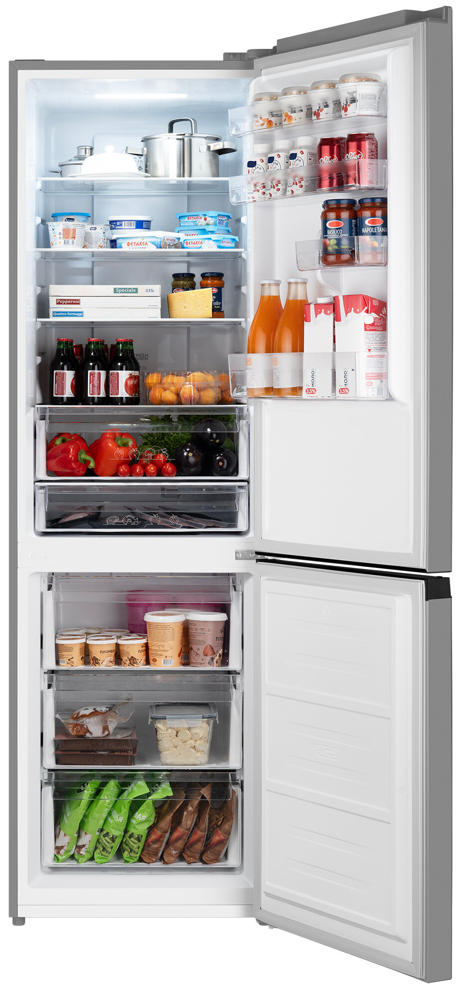 Стандартный двухметровый холодильник. Тихонько что-то там внутри гоняет себе, нам не мешает. Внутри продуманный, ничего не съедает место.