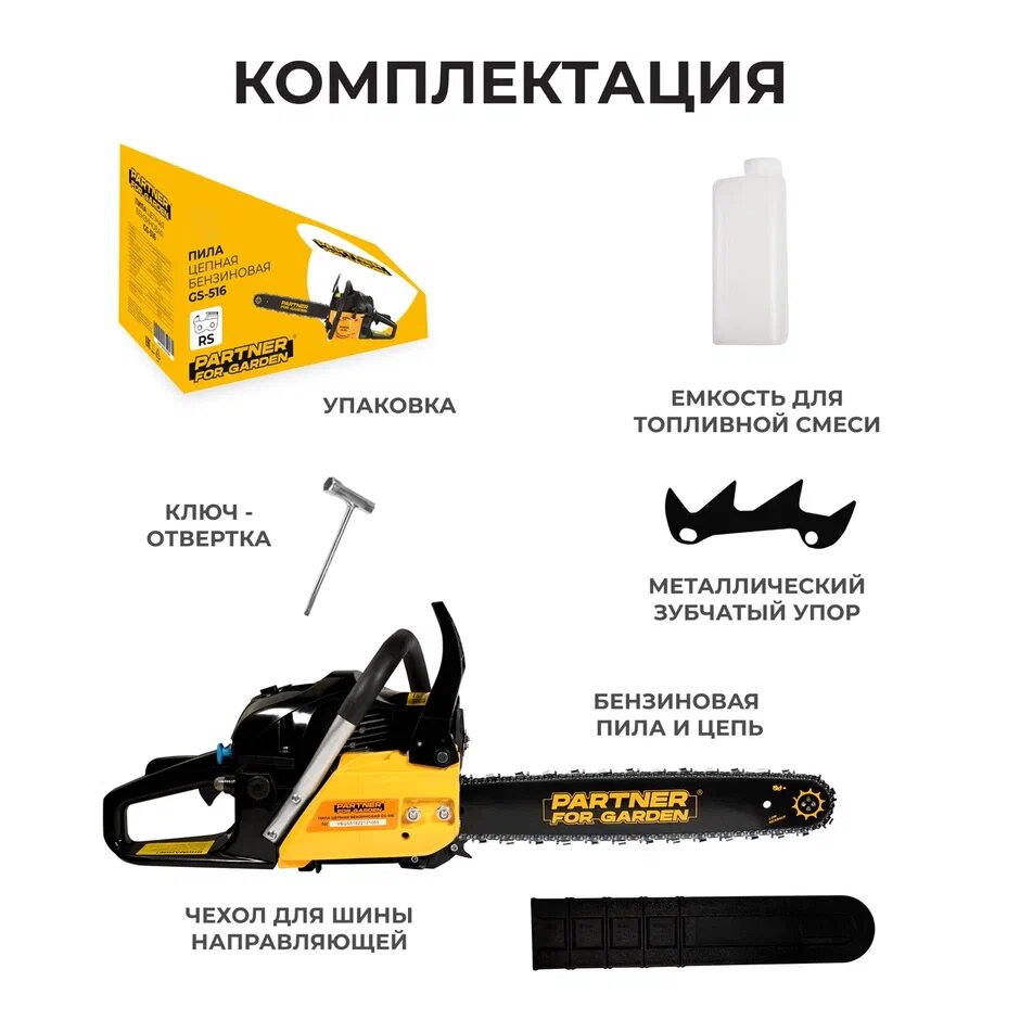 Бензопила / Бензопила бензиновая / Пила Partner for Garden GS-516P бензиновая ( 3,5 л.с, мощность 2,4 кВт, длина шины 16" - 40 см )