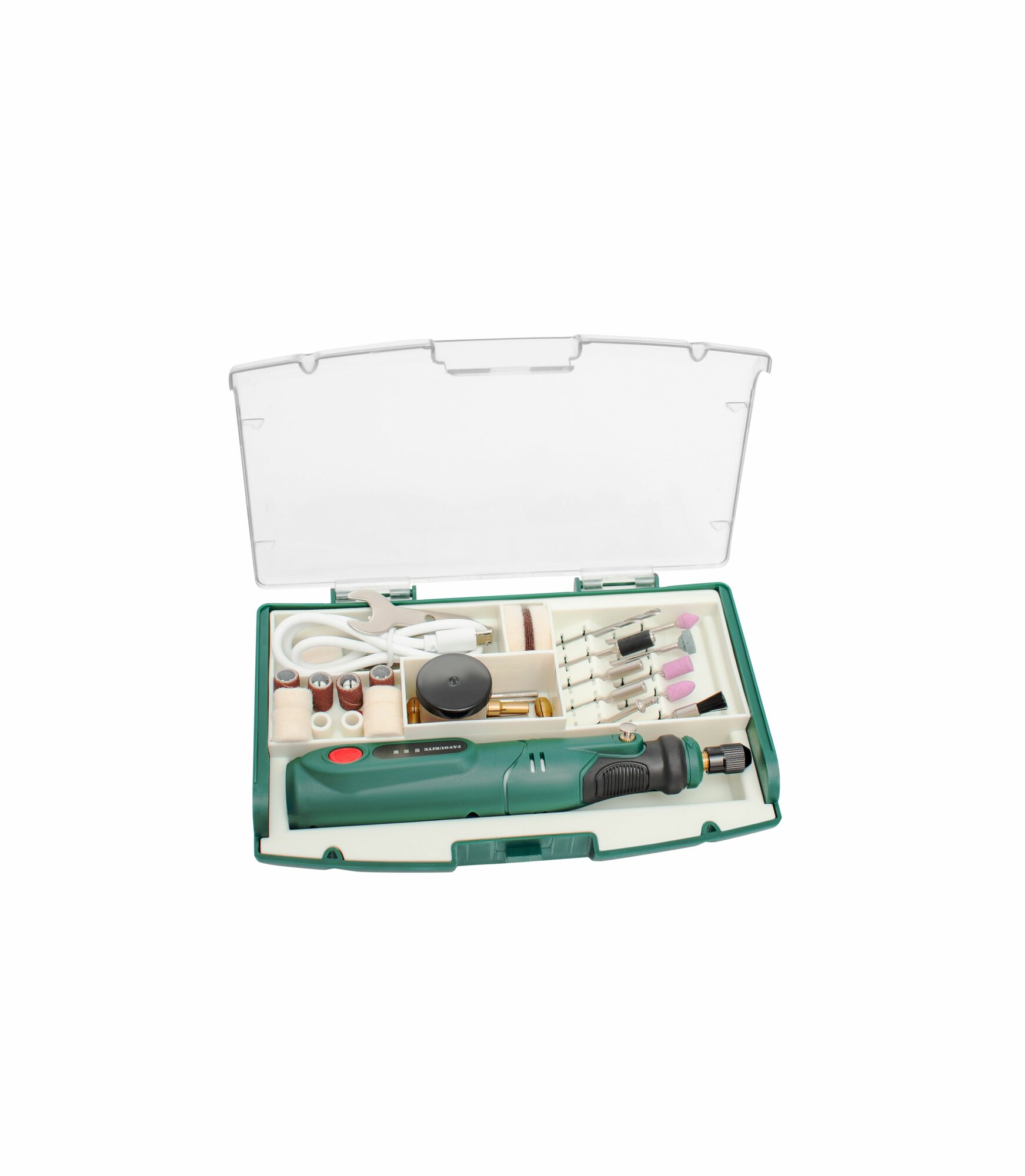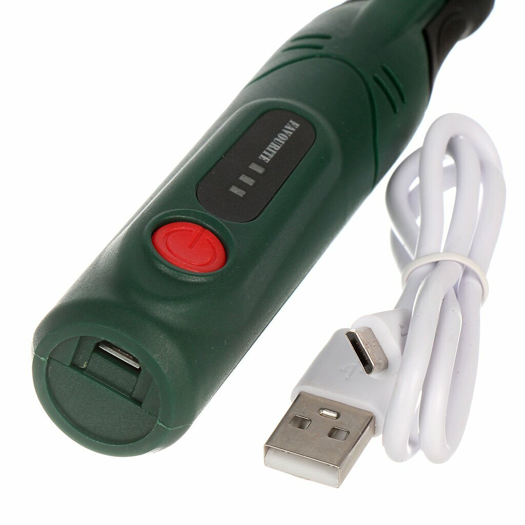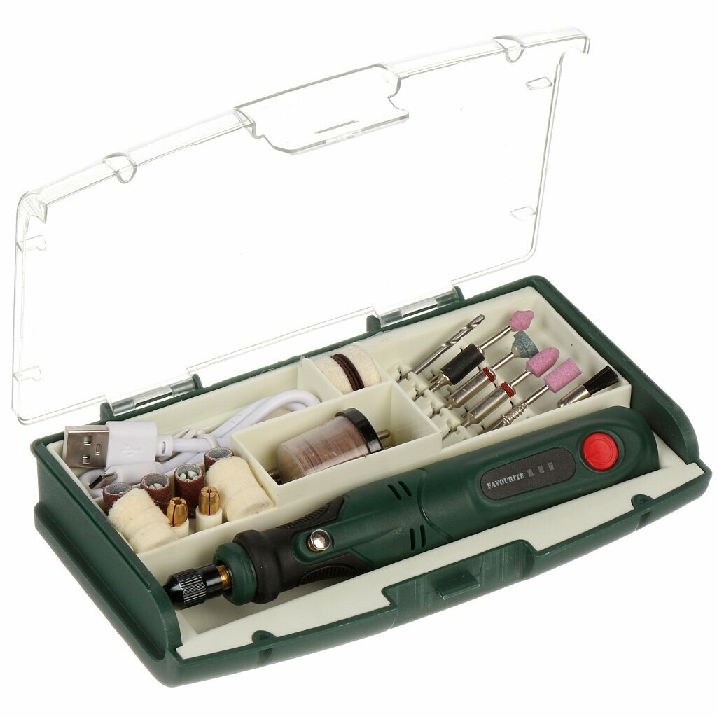 Гравер аккумуляторный с насадками, шлифовальная машинка FAVOURITE FGM, 3,6 В, 1.3 А/ч, 5000-15000 об/мин, 94 насадки, кейс