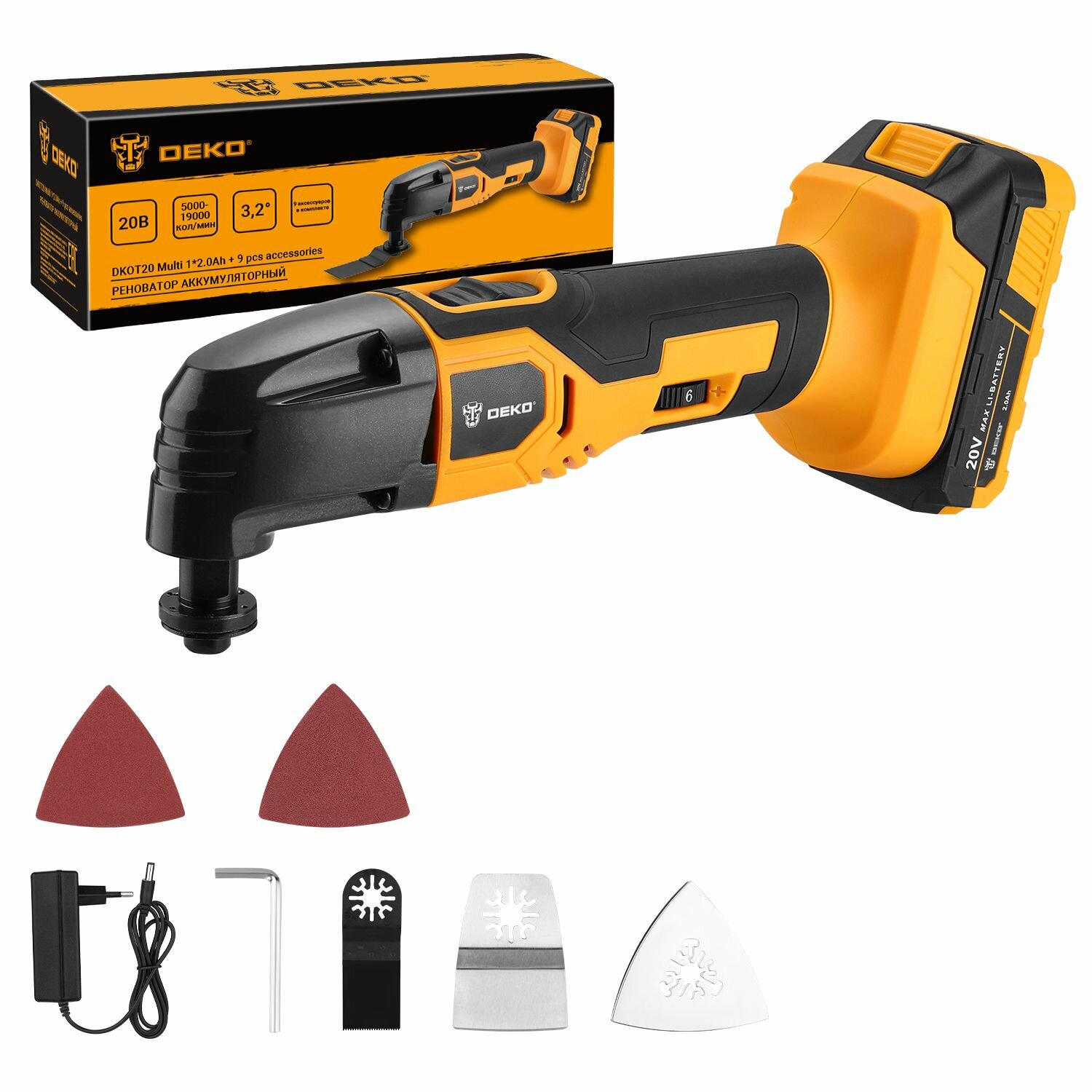 Реноватор DEKO DKOT20 Multi + набор предметов 9 шт, 20В, 1*2.0Ач, з/у