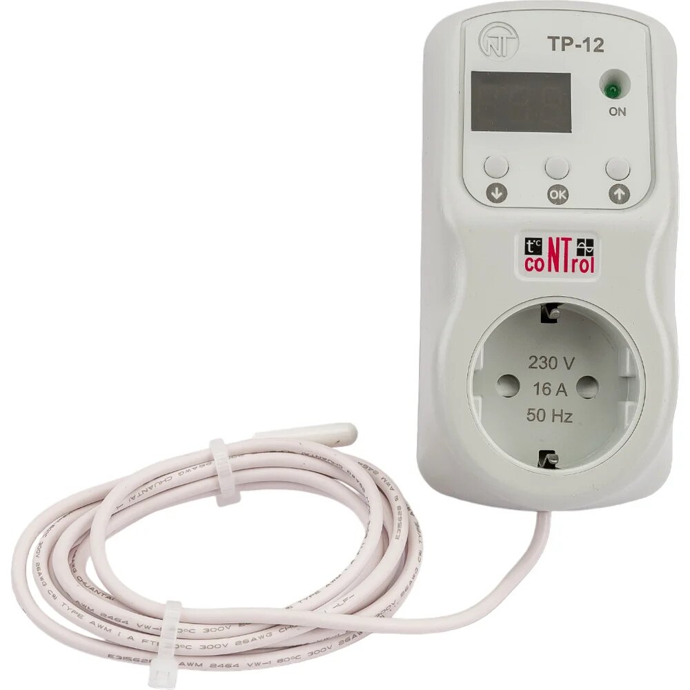 Терморегулятор Новатек-Электро ТР-12-2 с встроенным реле напряжения, 16А, от - 10 до +90, датчик 1,8 м снизу