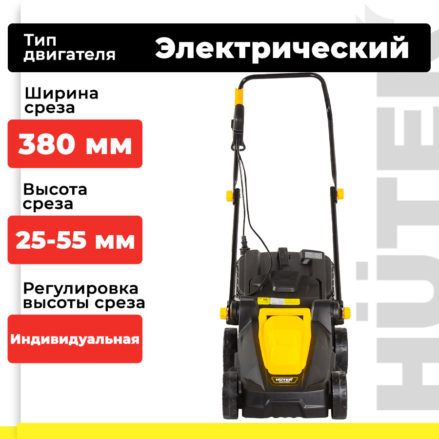 Газонокосилка электрическая, Huter, ELM-1400Т, 38 см, 35 л, 18-65 мм, 1400 Вт, 3200 об/мин, 70/4/6