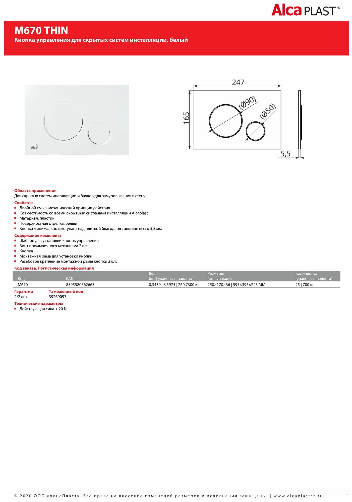 Кнопка управления Alcaplast Thin M670, для унитаза, панель и кнопки: белый глянцевый