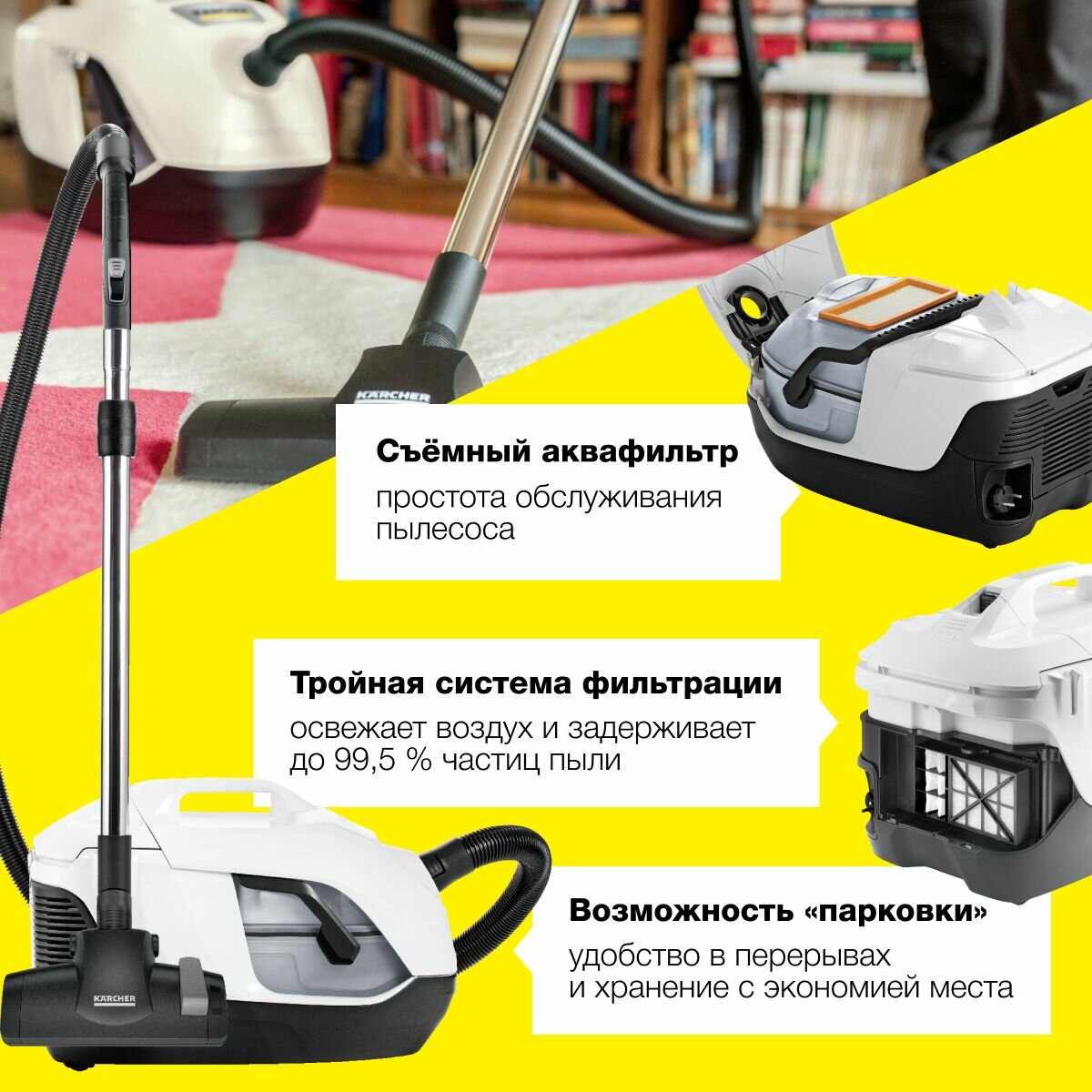 Купить Пылесос для дома Karcher DS 6 Plus 1.195-252.0, с аквафильтром, многоступенчатая система фильтрации, 4 насадки, 650 Вт, 80 Дб, в комплекте пеногаситель FoamStop, белый/черный