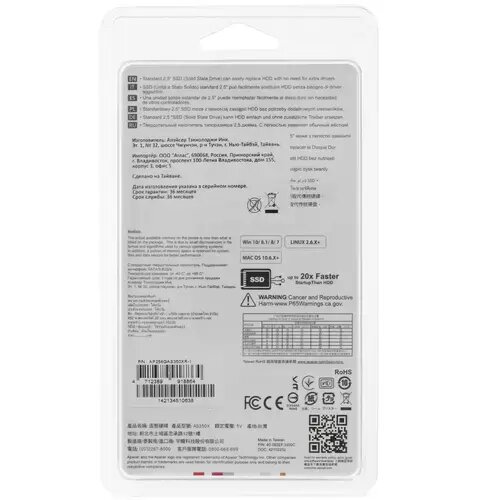 Твердотельный накопитель Apacer SSD PANTHER AS350X 256Gb SATA 2.5" 7mm, R560/W540 Mb/s, 3D NAND, IOPS 81K/74K, MTBF 1,5M, 180TBW, Retail, 3 years (AP256GAS350XR-1)