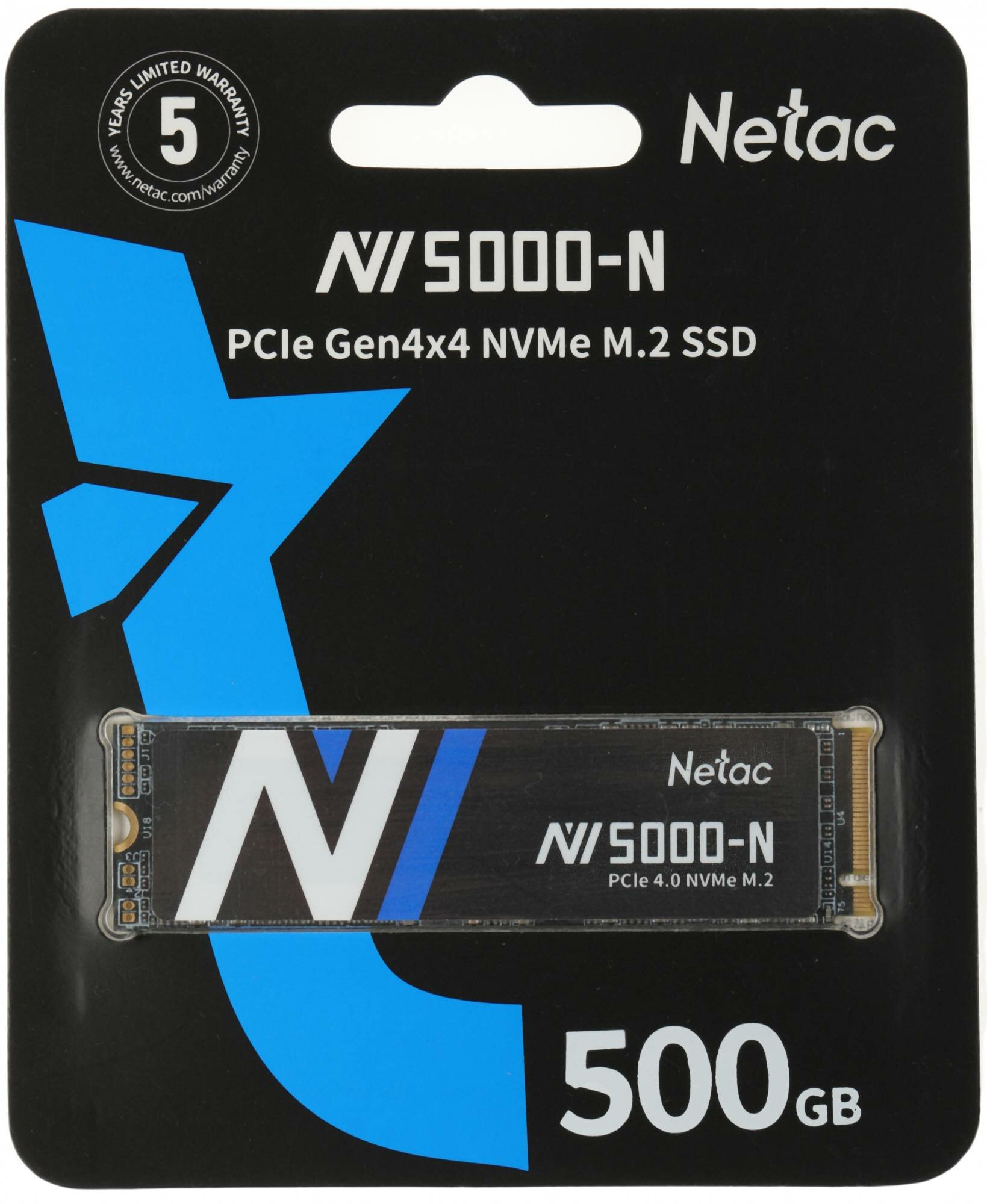 Накопитель Netac SSD NV5000-N 500GB PCIe 4 x4 M.2 2280 NVMe 3D NAND, R/W up to 4800/2700MB/s, TBW 320TB, without heat sink (NT01NV5000N-500-E4X)