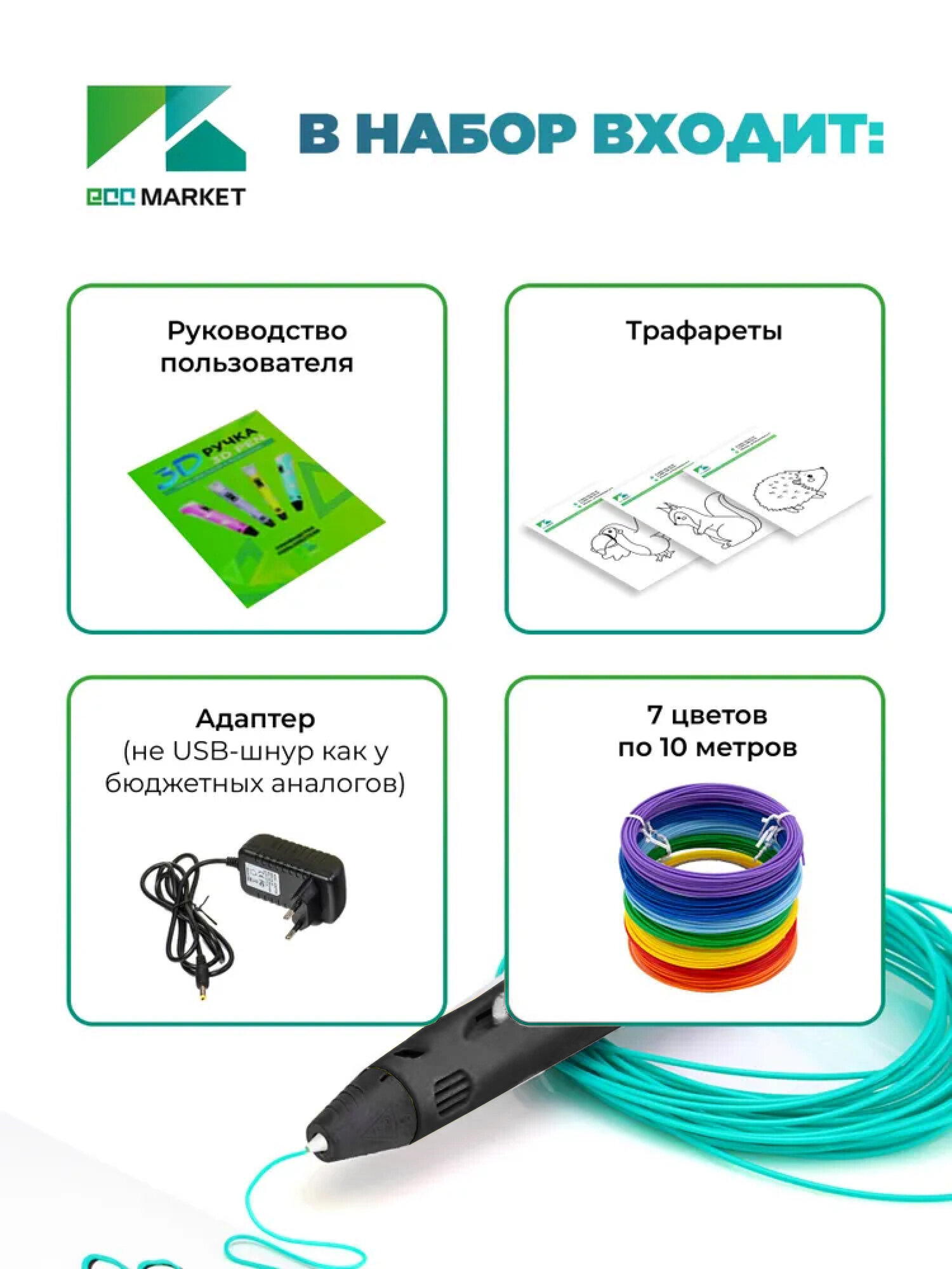 | Комплектация | ручка, подставка из жаропрочного пластика,инструкция на русском языке, набор пластика "РАДУГА" (7 цветов), трафареты для 3Д печати |
