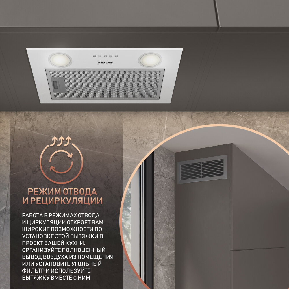 Встраиваемая вытяжка Weissgauff BOX 452 White, цвет корпуса белый, цвет окантовки/панели белый 3 года гарантии, Алюминиевый жировой фильтр, Низкий уровень шума интересное: