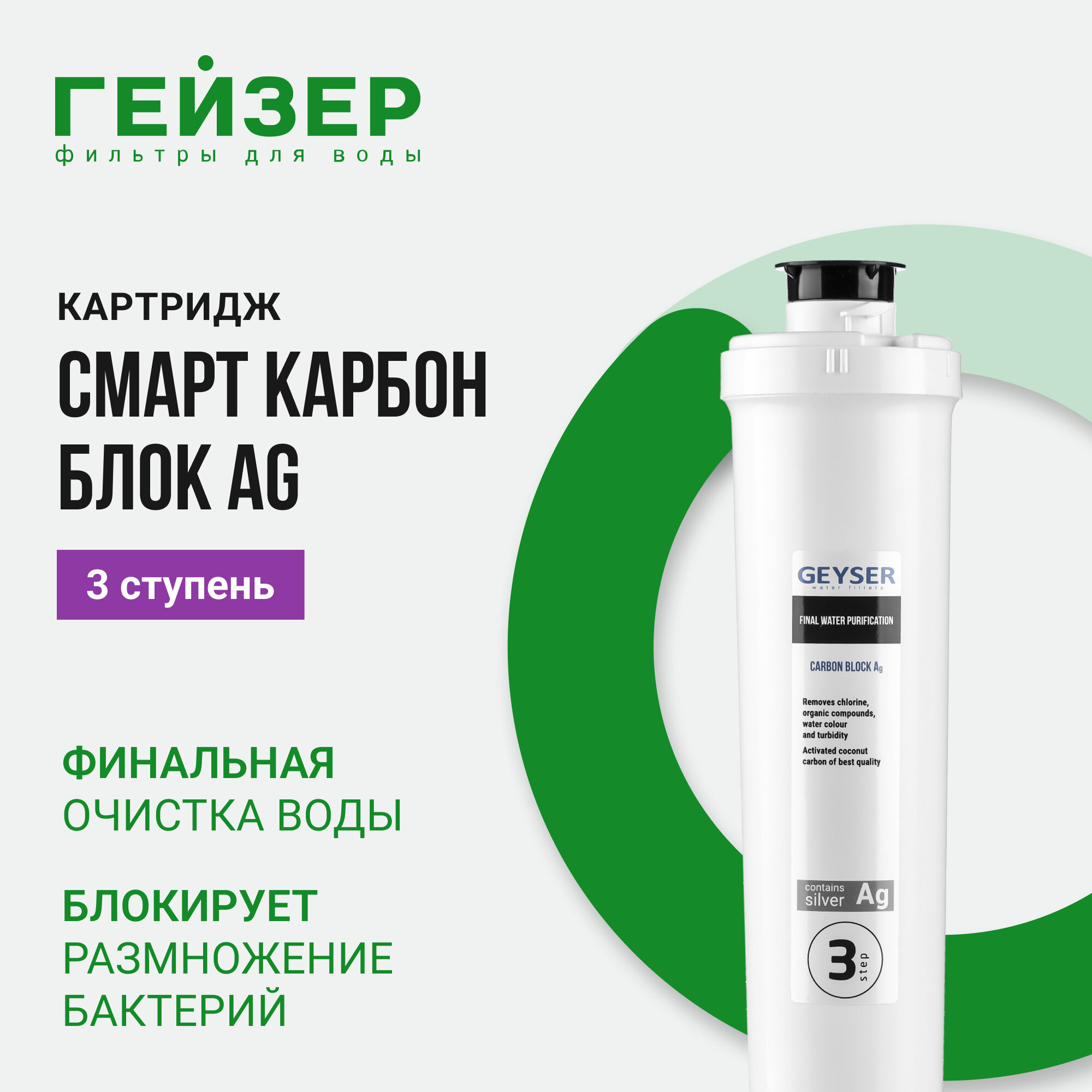 Сменный картридж Гейзер Карбон Блок Ag Смарт, содержит высококачественный активированный уголь, 30645
