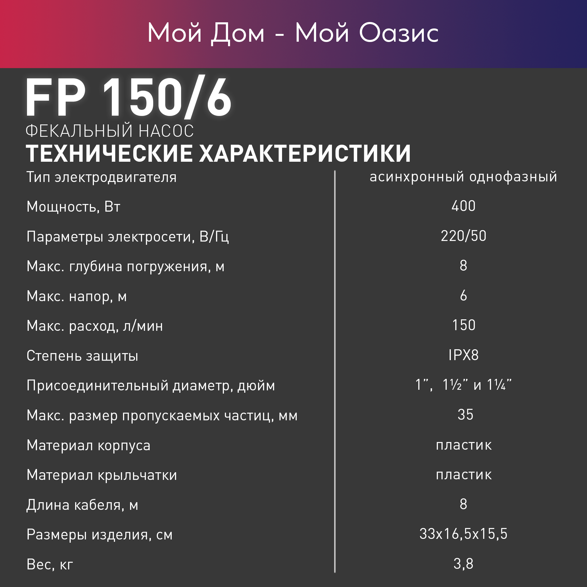 Насос фекальный погружной making Oasis everywhere FP 150/6, 400 Вт, напор 6 м, 150 л/мин