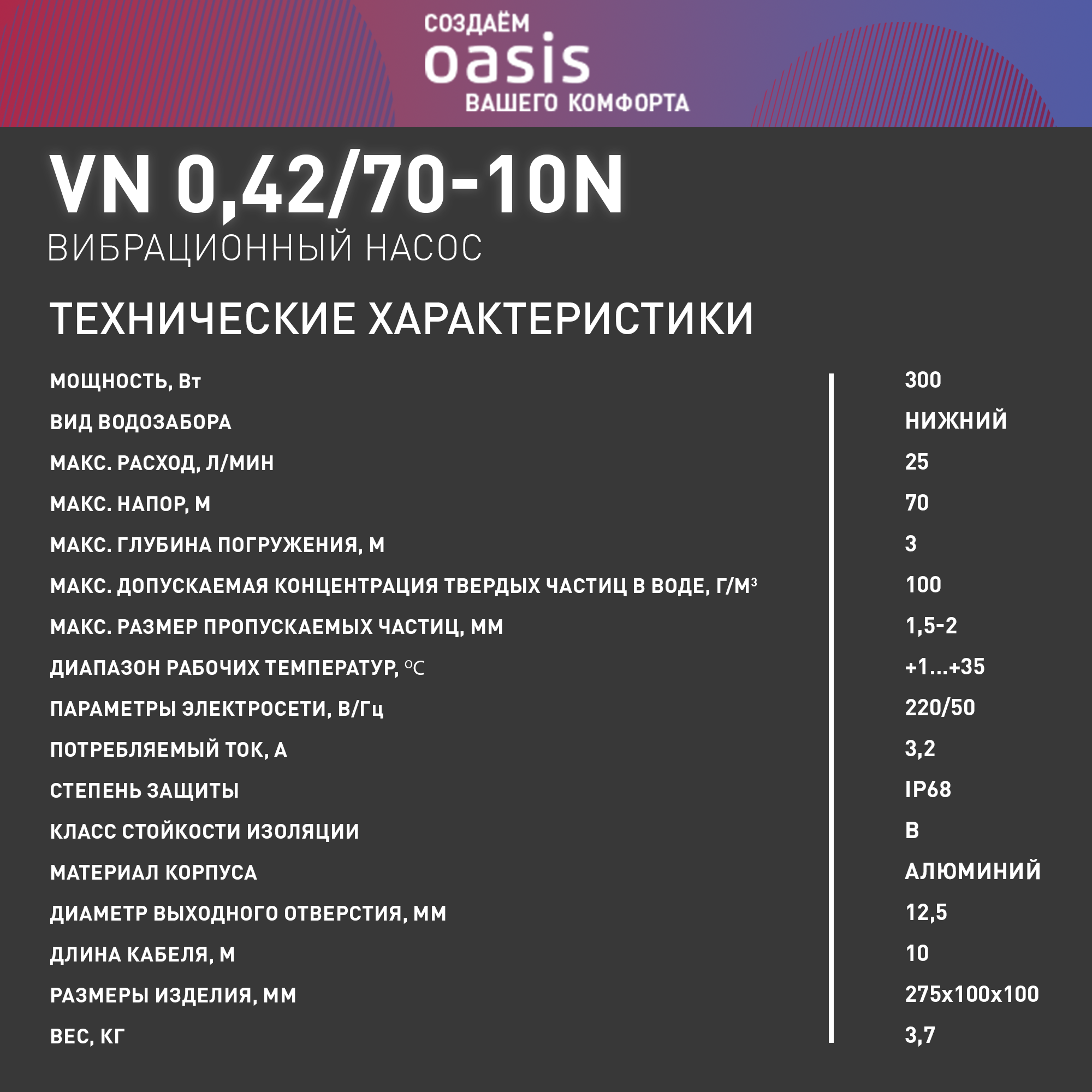 Насос вибрационный OASIS VN 0.42/70 - 10N (К) "making Оasis everywhere"