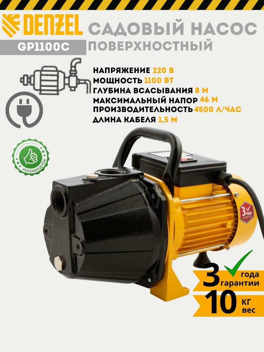 Садовый поверхностный насос GP1100C, 1100 Вт, 4500 л/ч, подъем 46 м, чугун Denzel