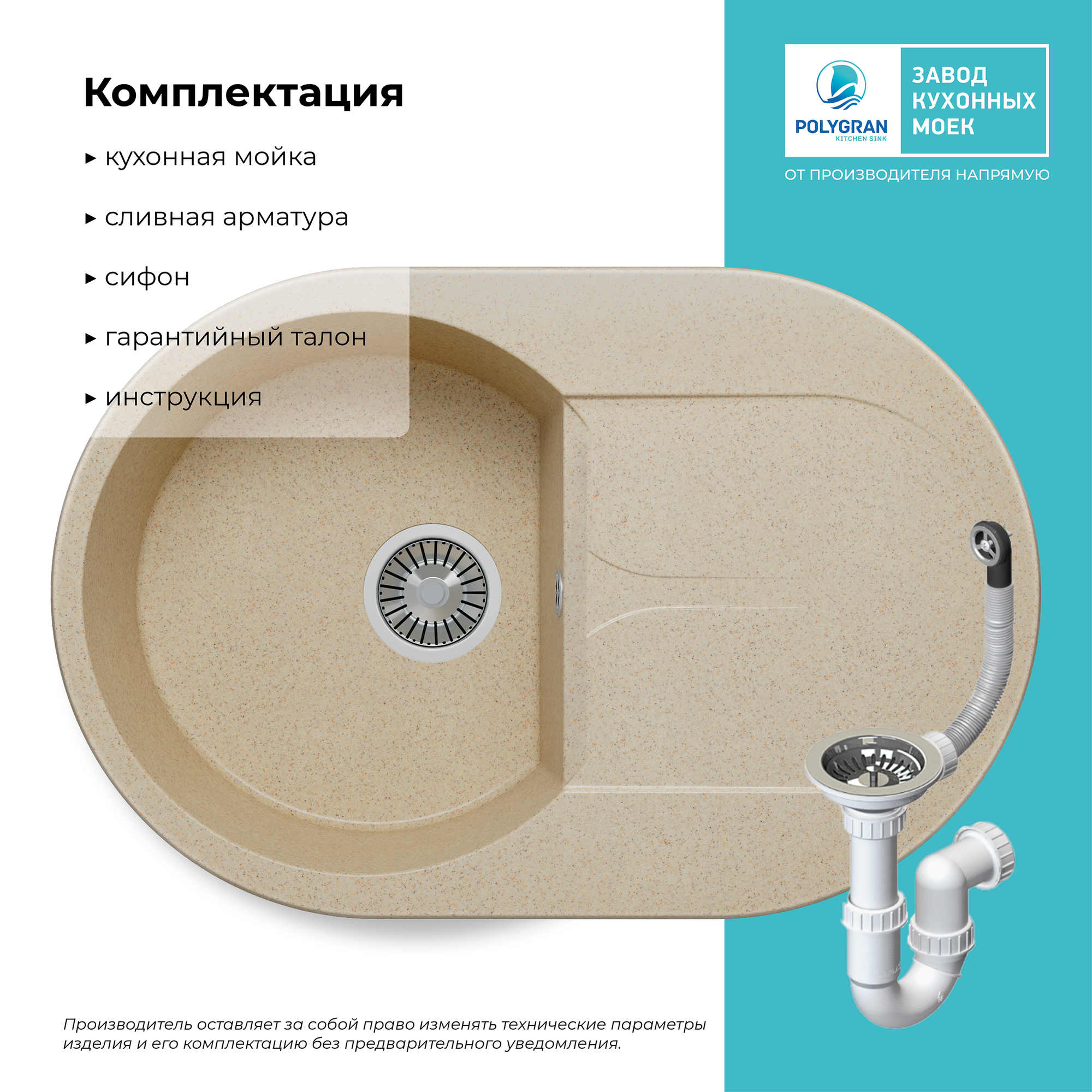 Мойка для кухни каменная POLYGRAN ATOL-760, бежевая, врезная, круглая, с крылом (№327 Кремовый)