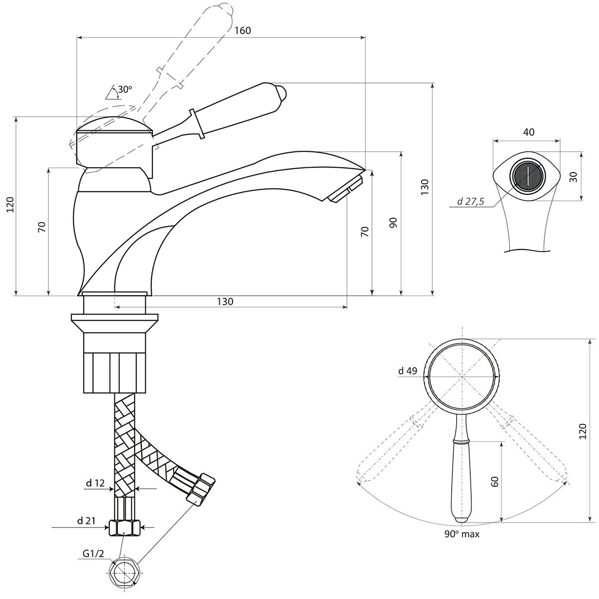Смеситель для раковины, одноручный, гибкая подводка 50см (Славен)