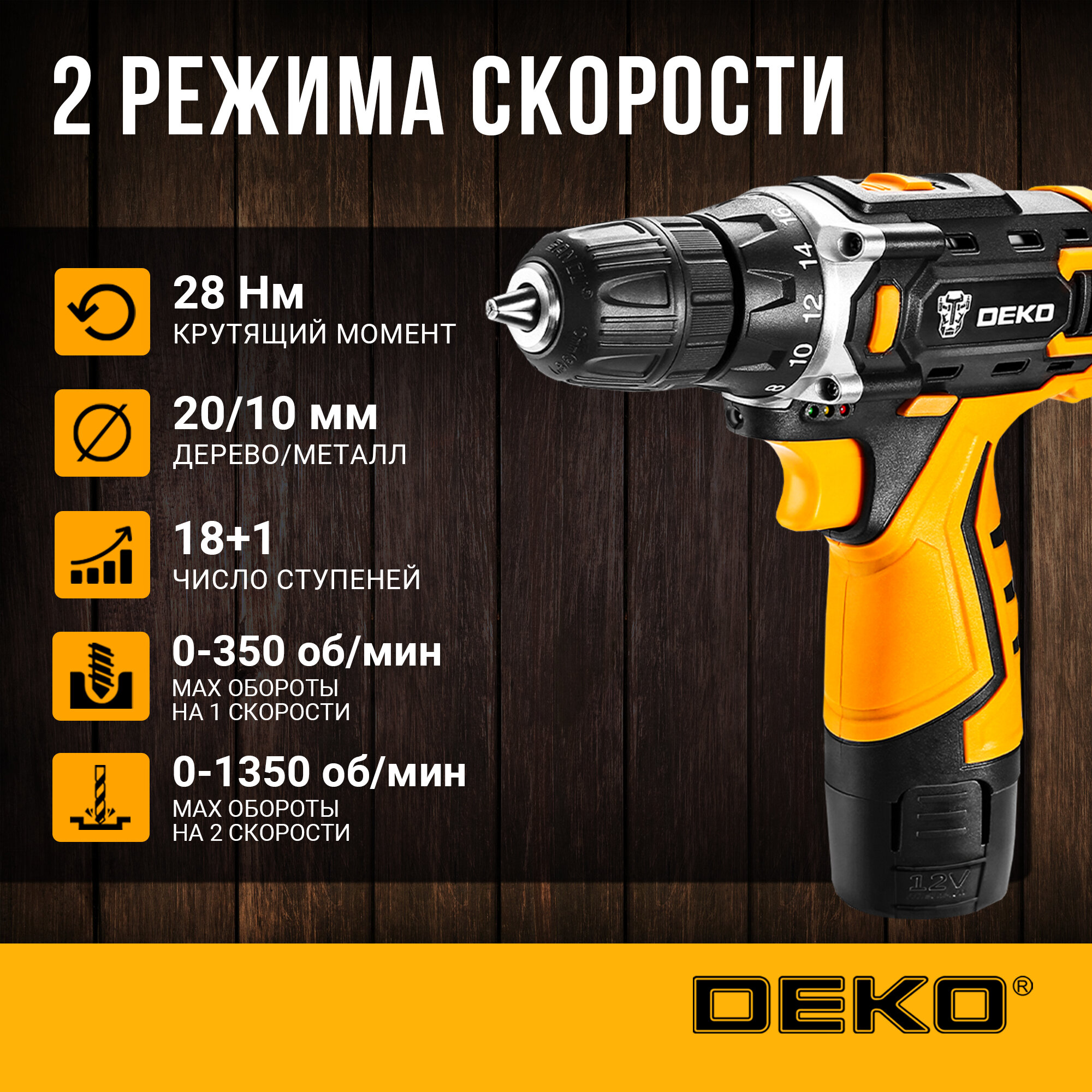 Дрель-шуруповерт DEKO DKCD12FU-Li-Ion 1.5Ач, с двумя аккумуляторами [063-4117]