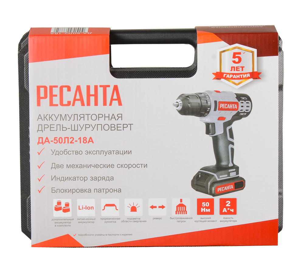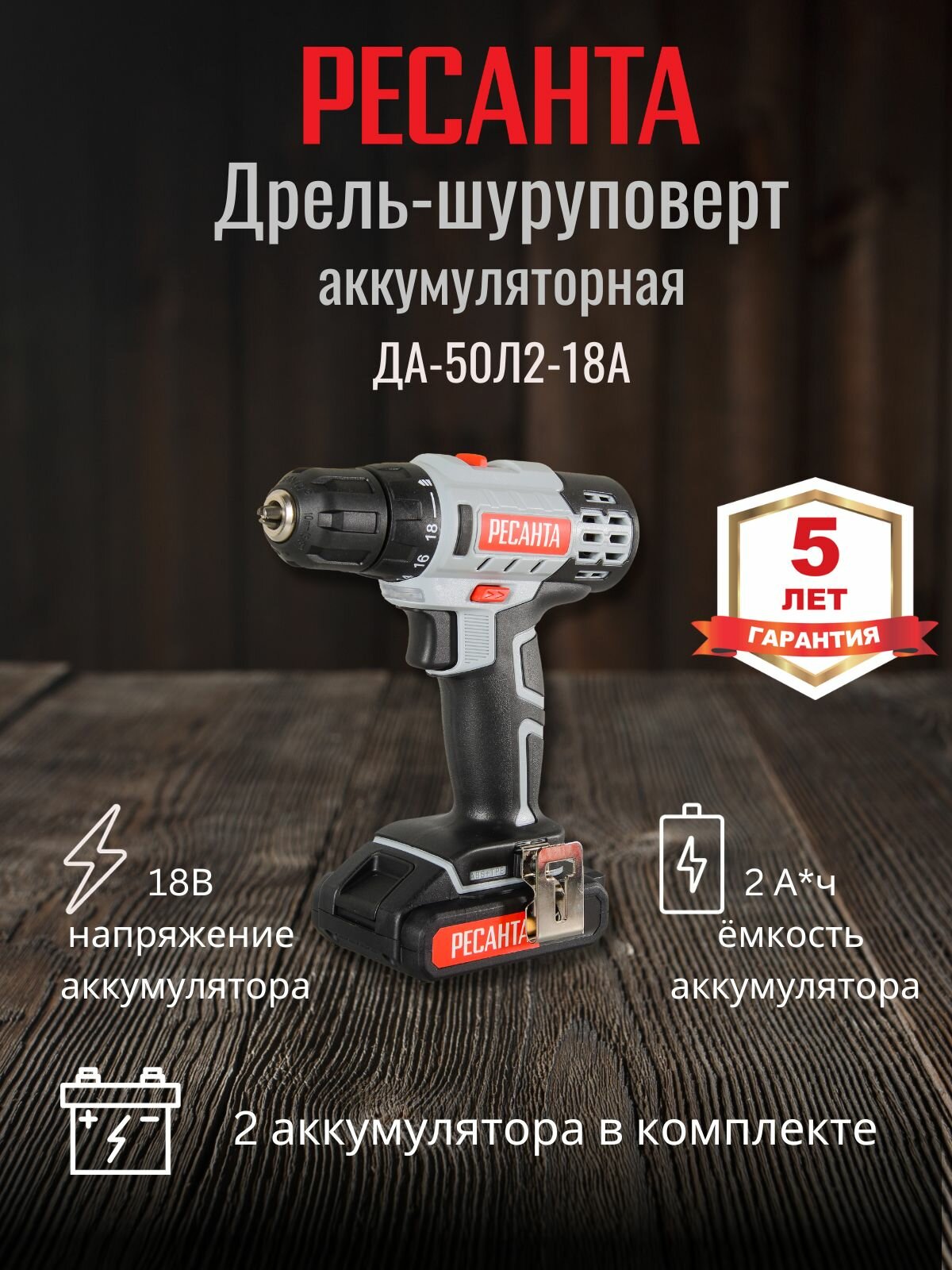 Дрель-шуруповерт аккумуляторная ДА-50Л2-18А Ресанта(2 аккумулятора, 18В, 50Нм, подсветка)