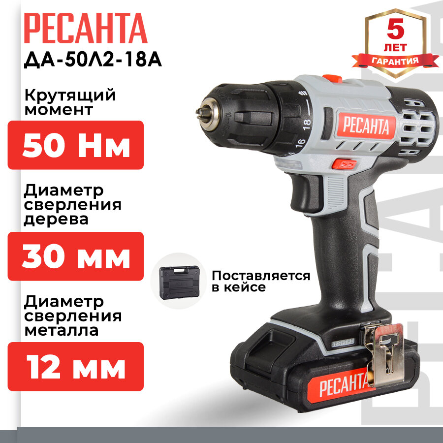 Шуруповерт аккумуляторный Ресанта ДА-50Л2-18А (18В, 2 АКБ, кейс)