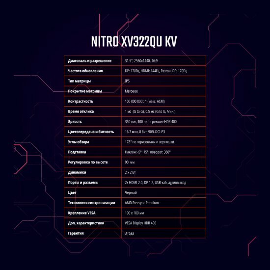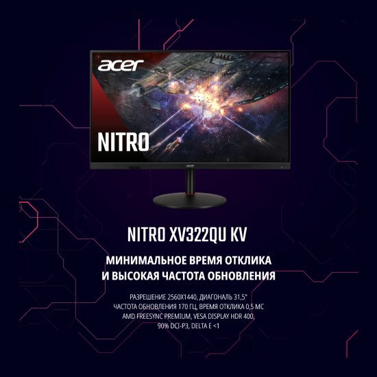 Монитор 31,5" ACER Nitro XV322QUKVbmiiprzx, IPS, 2560x1440, 170Hz, 1ms, 350 nits, 178°/178°, 2xHDMI + DP + Audio out + USB3.0x4 Hub + USB-B+ Колонки 2Wx2 , FreeSync Premium, HDR 400 (NEW)