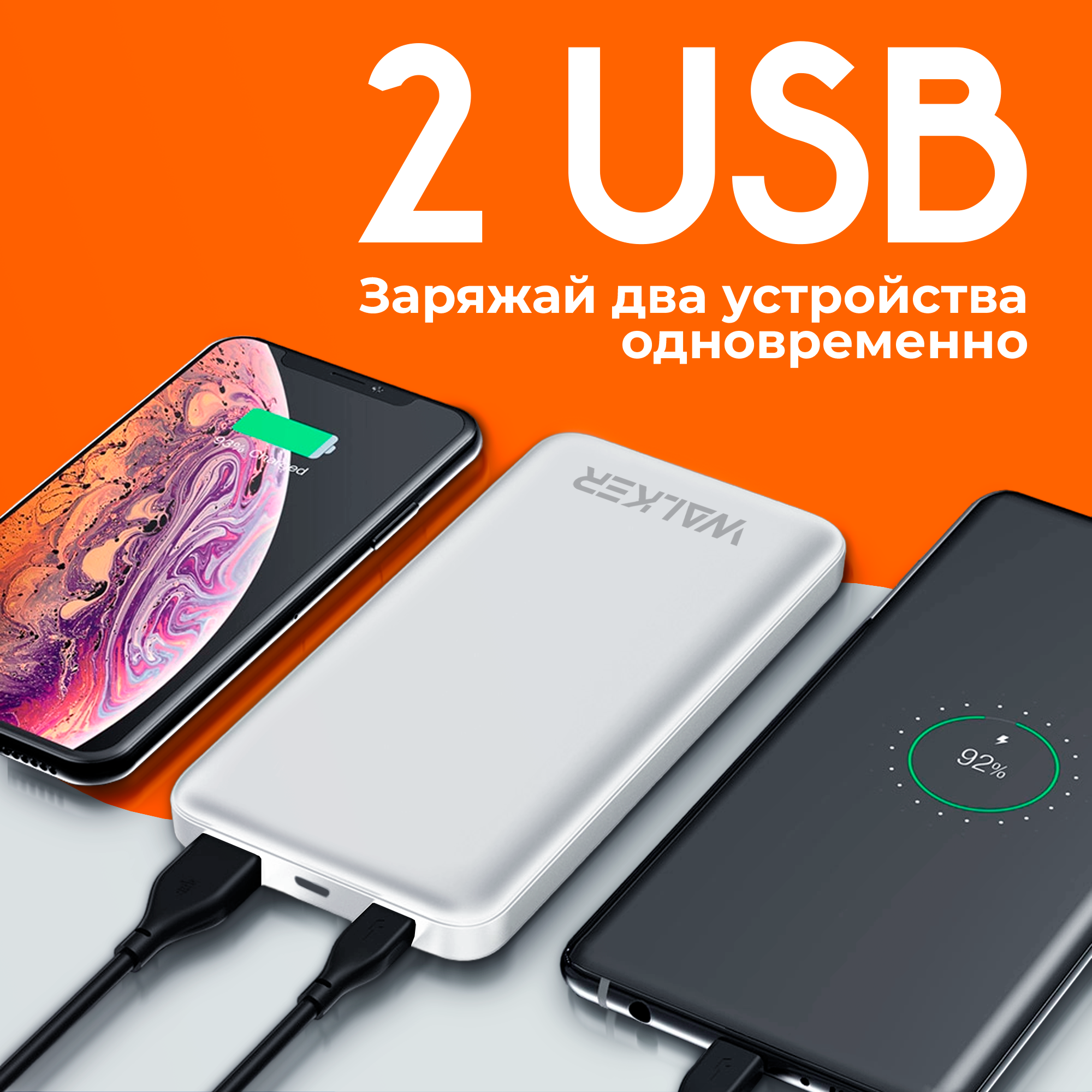 Повербанк 10000 mAh, WALKER, WB-410, 2.4 А, белый // powerbank, пауэр банк, power bank, павербанк, повербанк xiaomi, повербанк для айфона