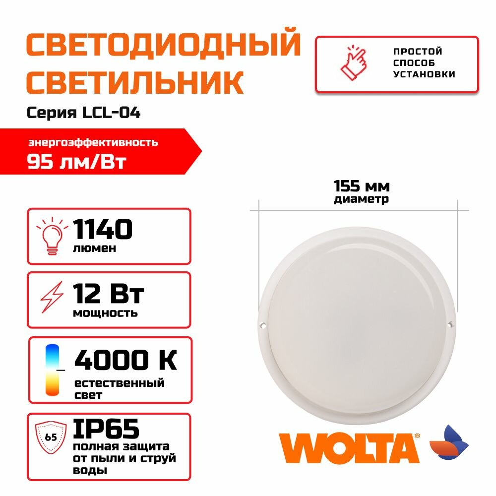 Wolta Светодиодный светильник ЖКХ LED 12Вт, 4000K Дневной свет, IP65, 960лм, круг LCL04-12W-R01-4K интересное: