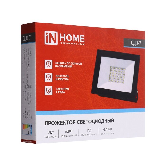 INhome Прожектор светодиодный IN HOME СДО-7, 50 Вт, 230 В, 6500 К, IP65, черный