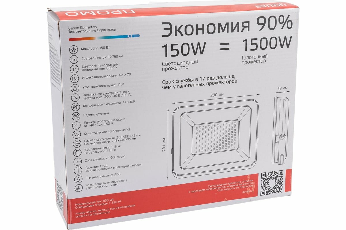 Gauss Прожектор светодиодный elementary 150w 12750lm ip65 6500к промо g2 черный 1/10 613100150P
