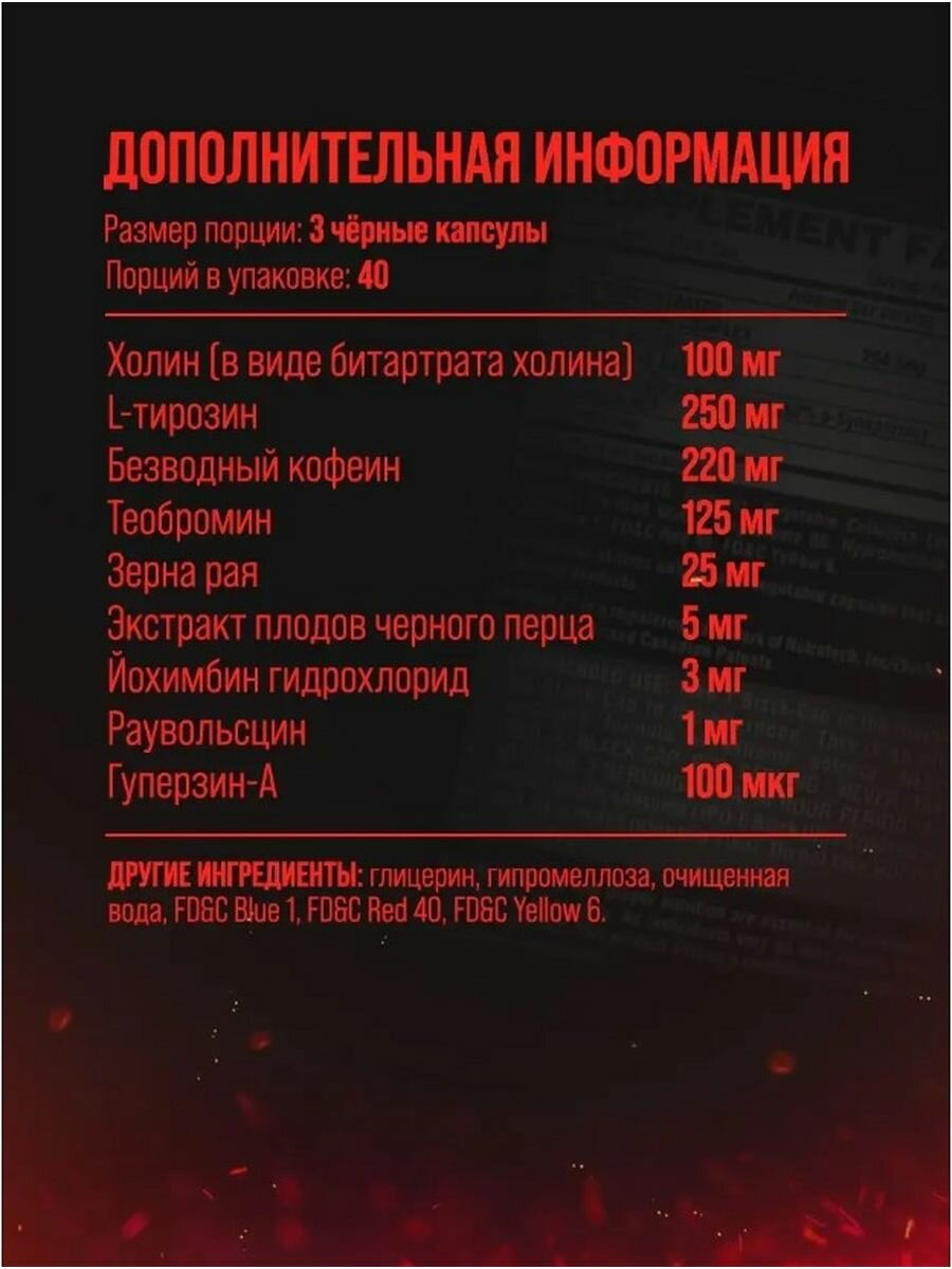 | Отзыв: | Это не жиросжигатель, а, скорее, предтренировочный комплекс — посмотрите разбор на YT, прежде чем заказывать себе. Заметный результат по количеству повторов и весу уже на третий день. |