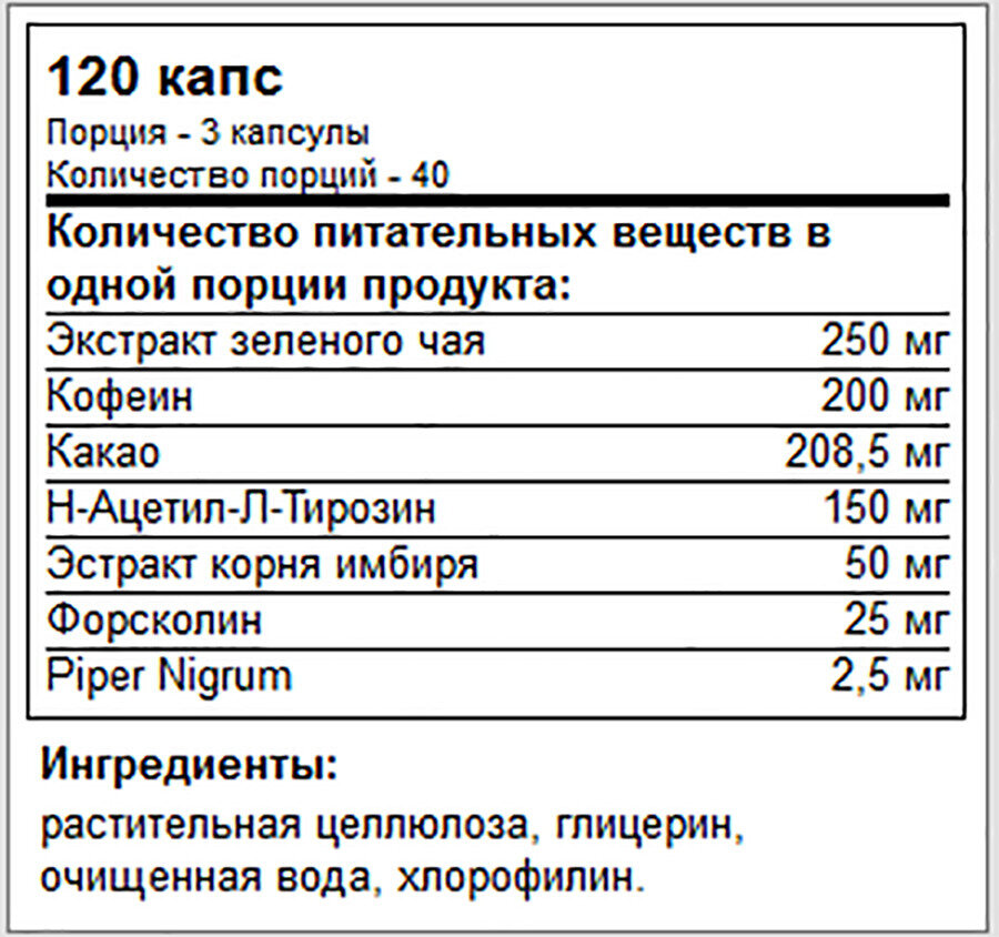 | Дополнительная информация | Состав На 3 капсулы: Экстракт зеленого чая - 250 мг, Теоброма какао (бобы) - 208,5 мг, Кофеин безводный - 200 мг, Н-Ацетил-Л-Тирозин - 150 мг, Экстракт корня имбиря - 50 мг, Колеус форсколии (корень) (содержащий форсколин) - 25 мг, Перец черный - 5 мг. Другие ингредиенты: глицерин, вегетарианская капсула (гидроксипропилметилцеллюлоза), очищенная вода, хлорофиллин. |