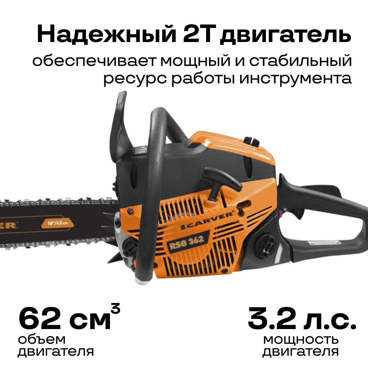 Бензопила CARVER RSG 362 (2,4 кВт, 3,2 л.с, 62 см.куб, шина 18"-45 см, цепь 0.325-1.5-72)