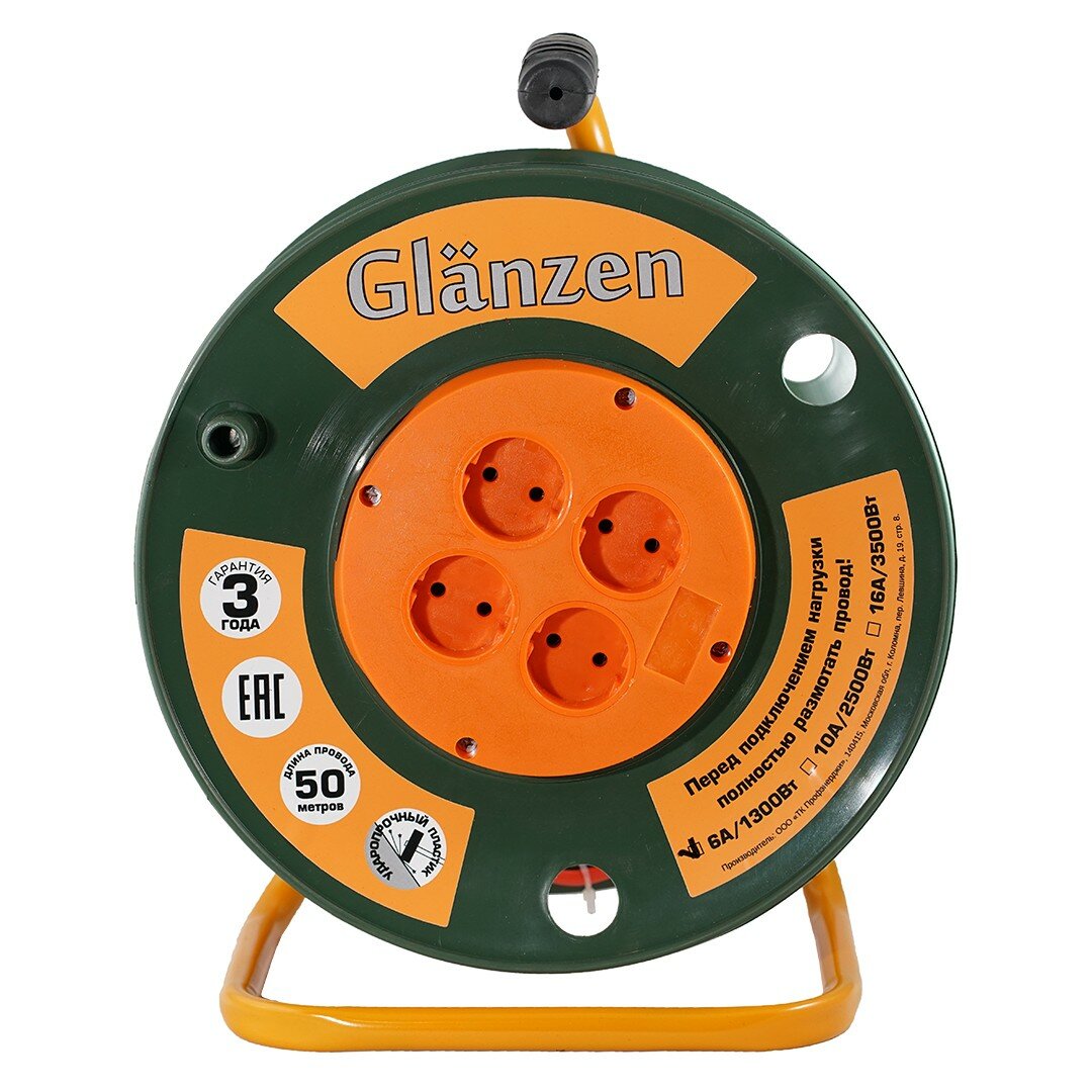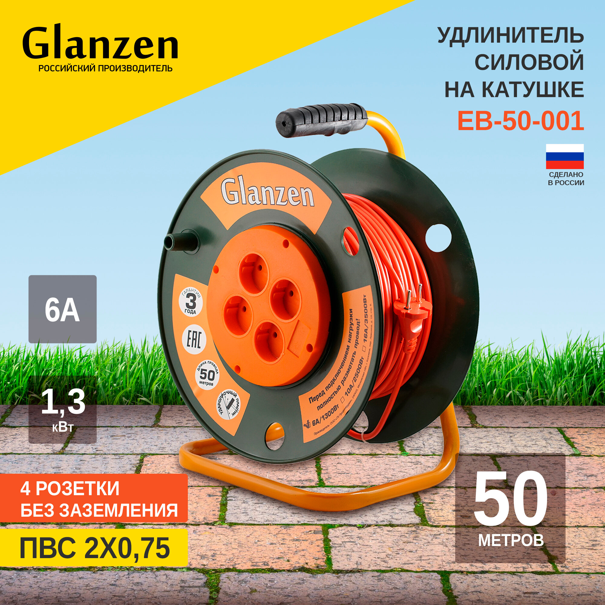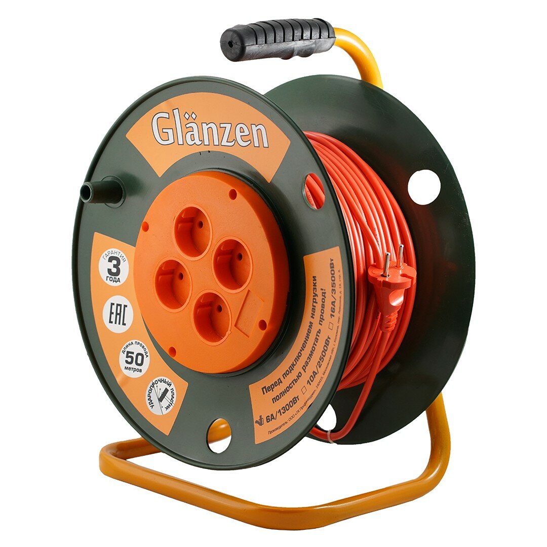 Удлинитель силовой на катушке GLANZEN 4 розетки ПВС 2х0,75 50м EB-50-001 1300Вт IP20 интересное: