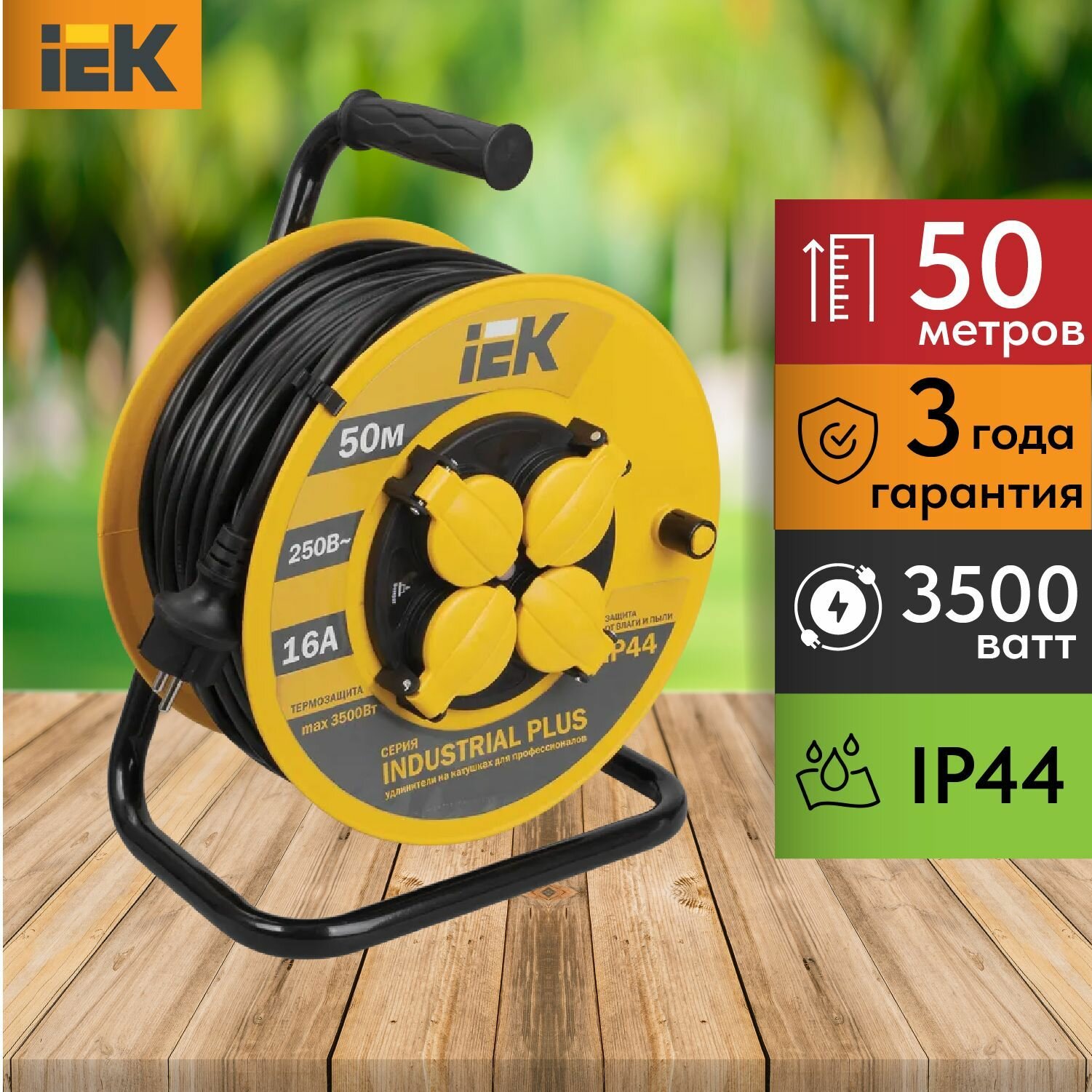 Катушка УК50 с термозащитой 4 места 2P+PE/50м 3х1,5мм2 IP44 INDUSTRIAL PLUS IEK