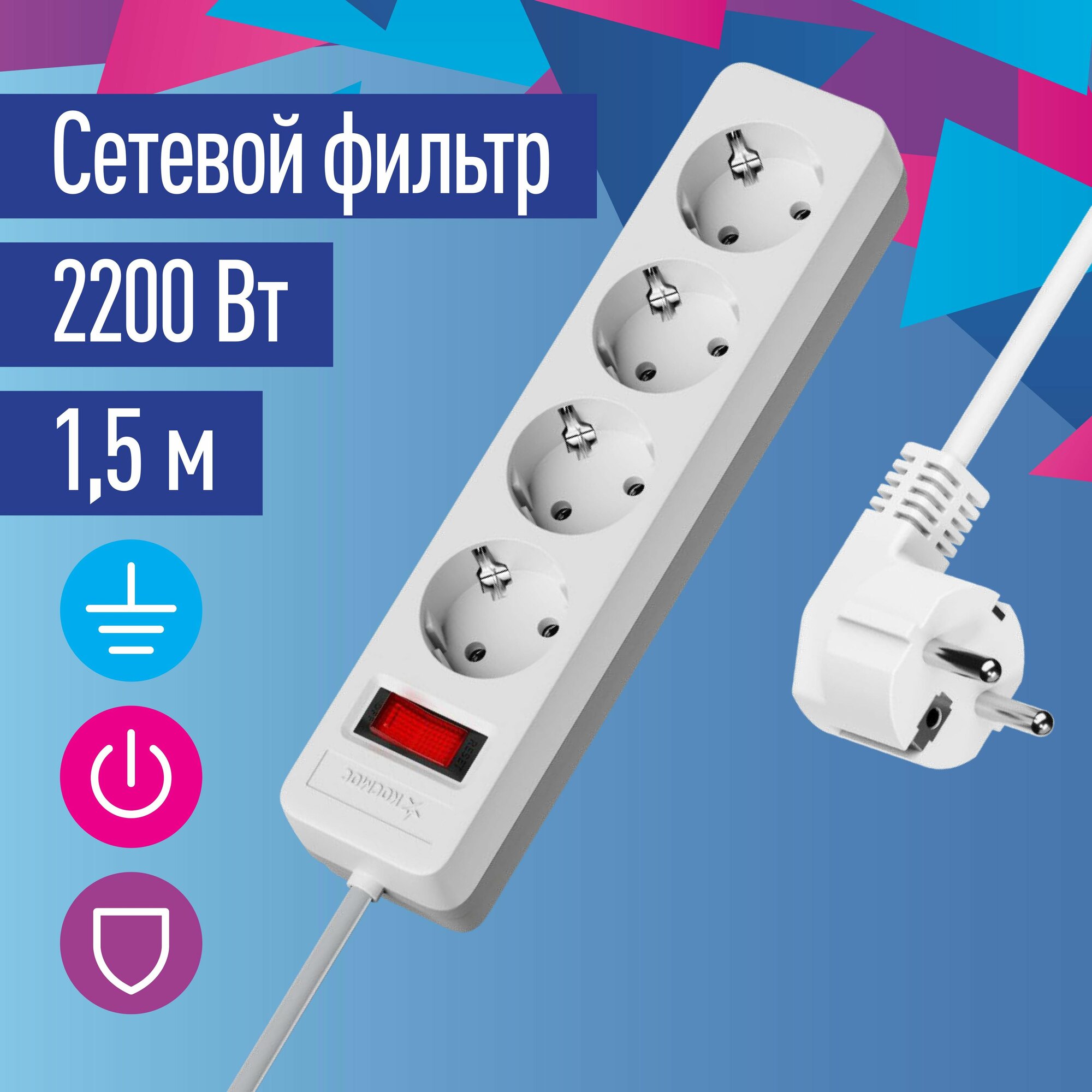Сетевой фильтр космос 1,5м 4 гнезда, пвс 3х0,75мм2, 10А/2,2кВт белый