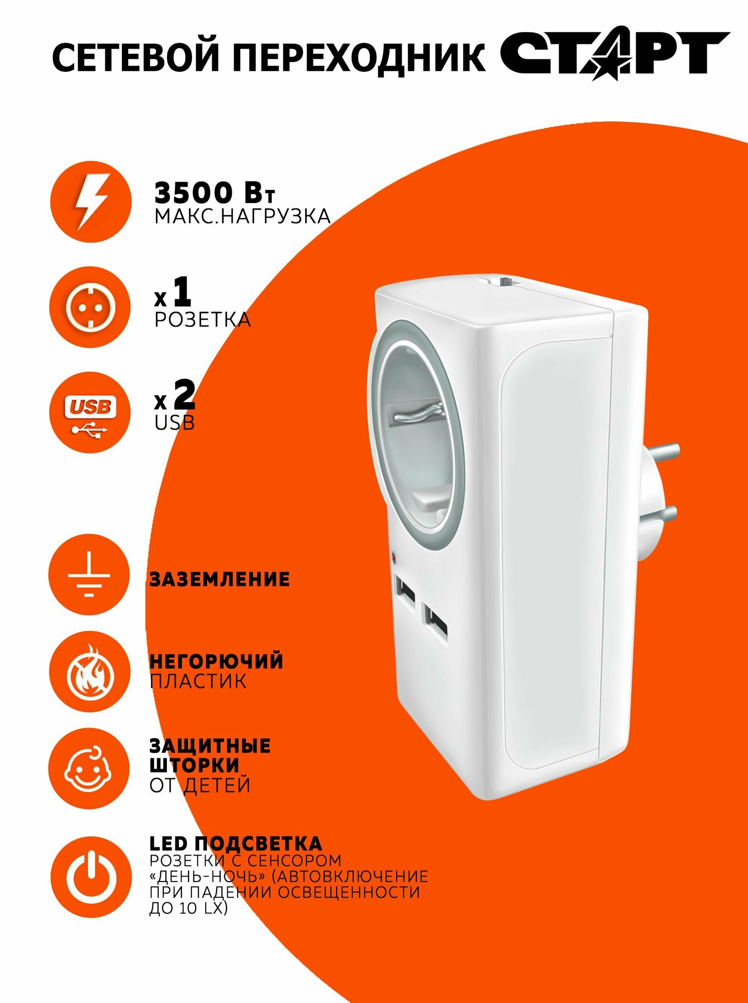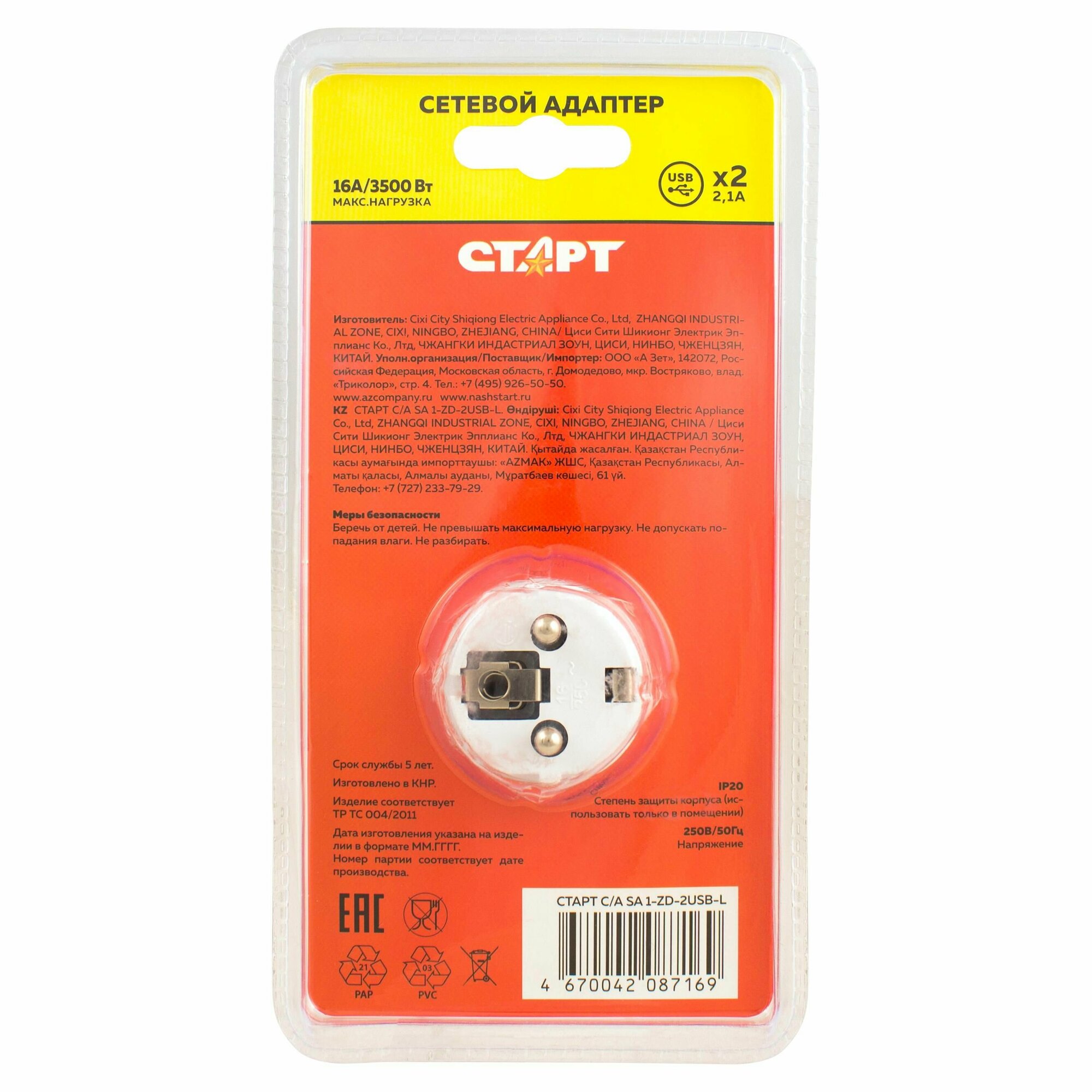 Сетевой адаптер Старт SA1/2-ZD, 2 розетки, белый
