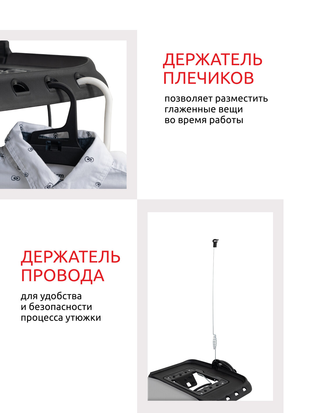 | Минусы: | Перфорированный лист слегка выпуклый, но не критично, чувствуется только при глажке, на качестве не отражается. |