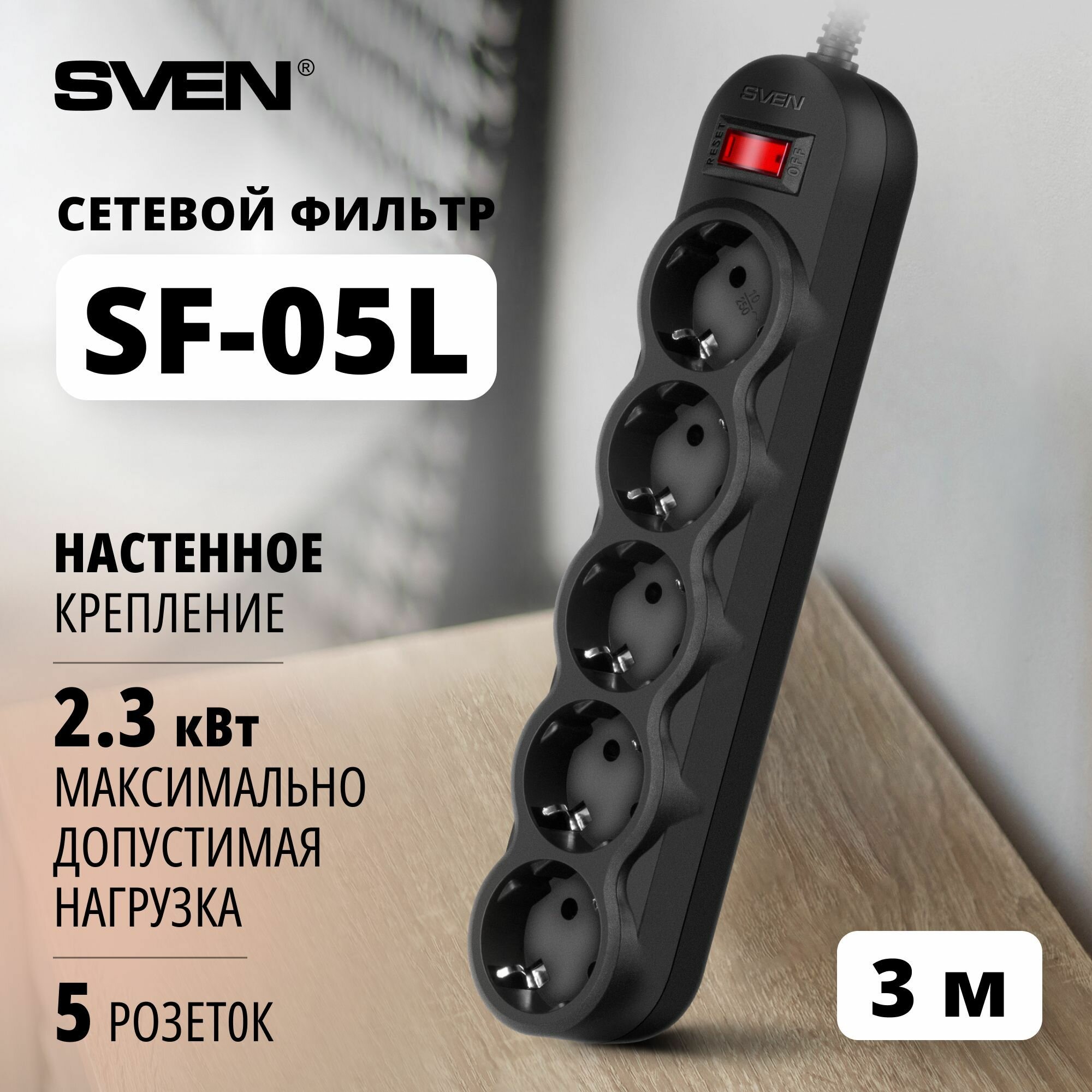 Удлинитель SVEN SF-05L, 5 розеток, с/з, 10А / 2200 Вт 5 3 м 262 мм 52 мм 40 мм черный интересное: