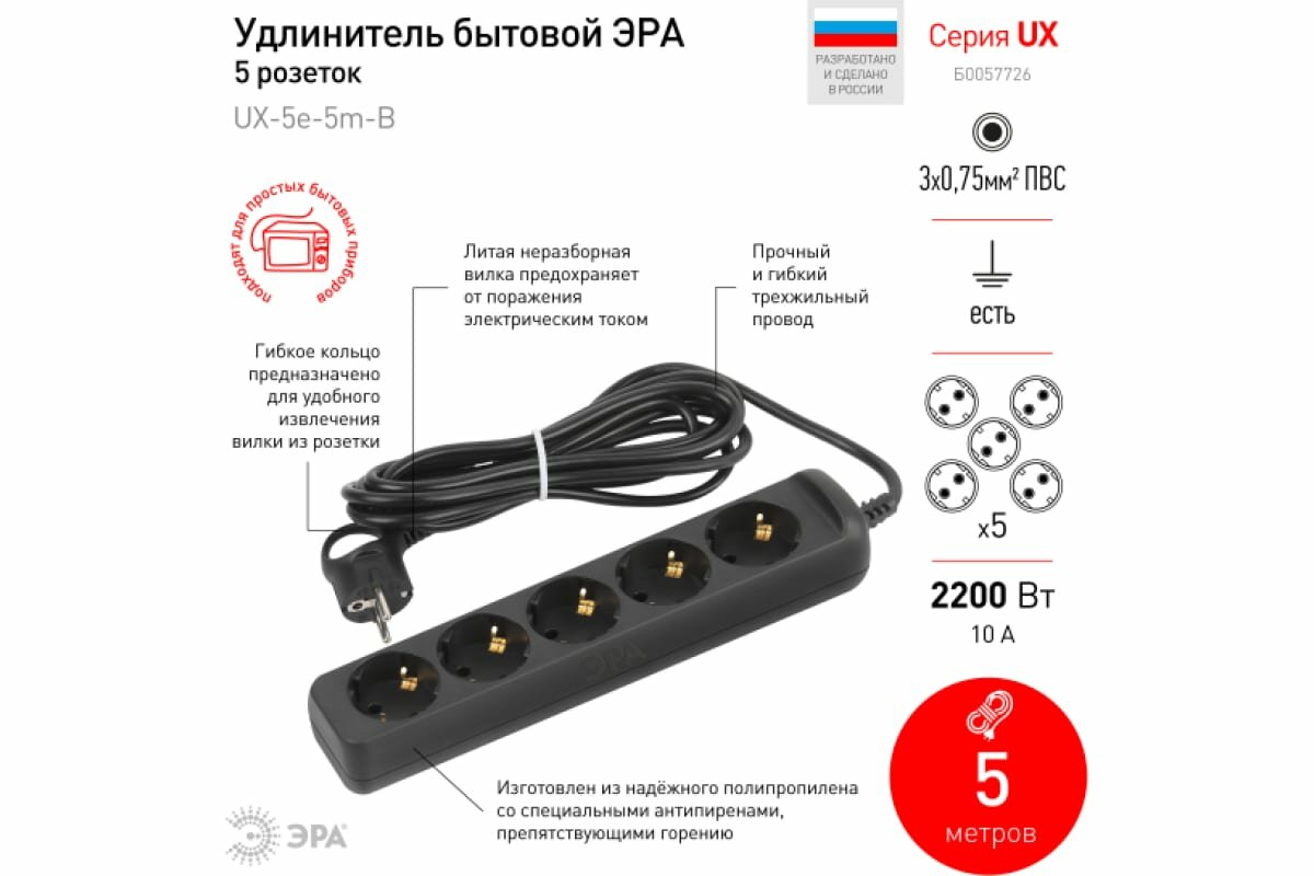 Эра Б0057726 Удлинитель электрический UX-5e-5m-B с заземлением 5 розеток 5 м ПВС 3х0,75мм2 10А черный