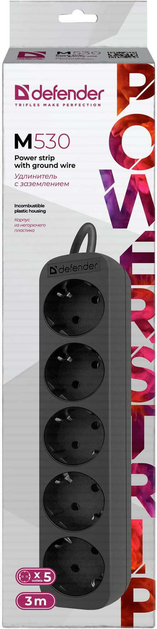Удлинитель Defender M530, 5 розеток, с заземлением, 3м, черный (арт. 367823)