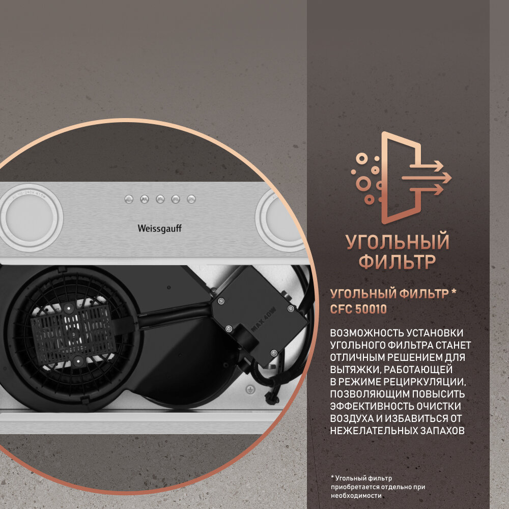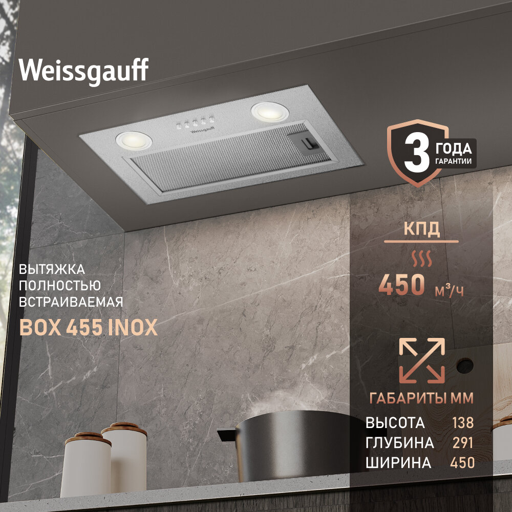 Встраиваемая вытяжка Weissgauff BOX 455 Inox, цвет корпуса нержавеющая сталь, цвет окантовки/панели серебристый 3 года гарантии, Алюминиевый жировой фильтр, Низкий уровень шума интересное: