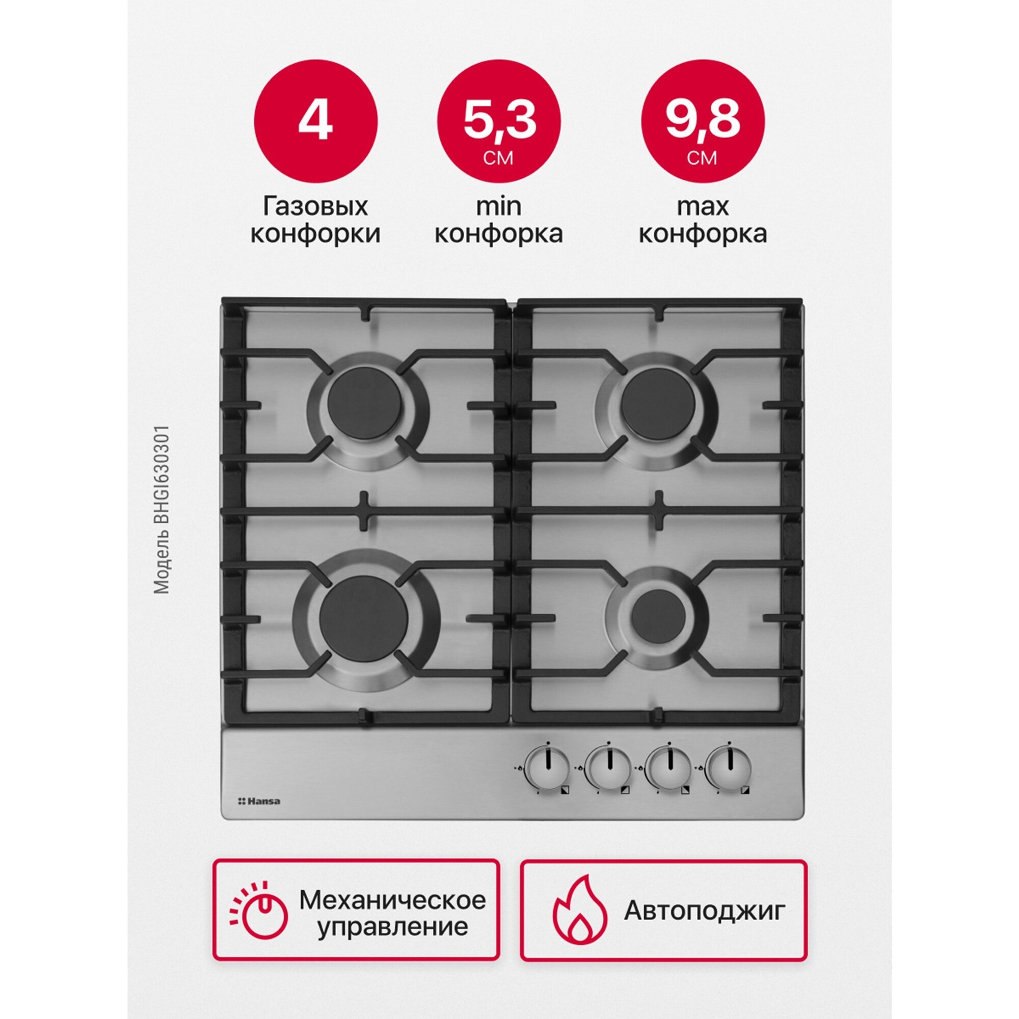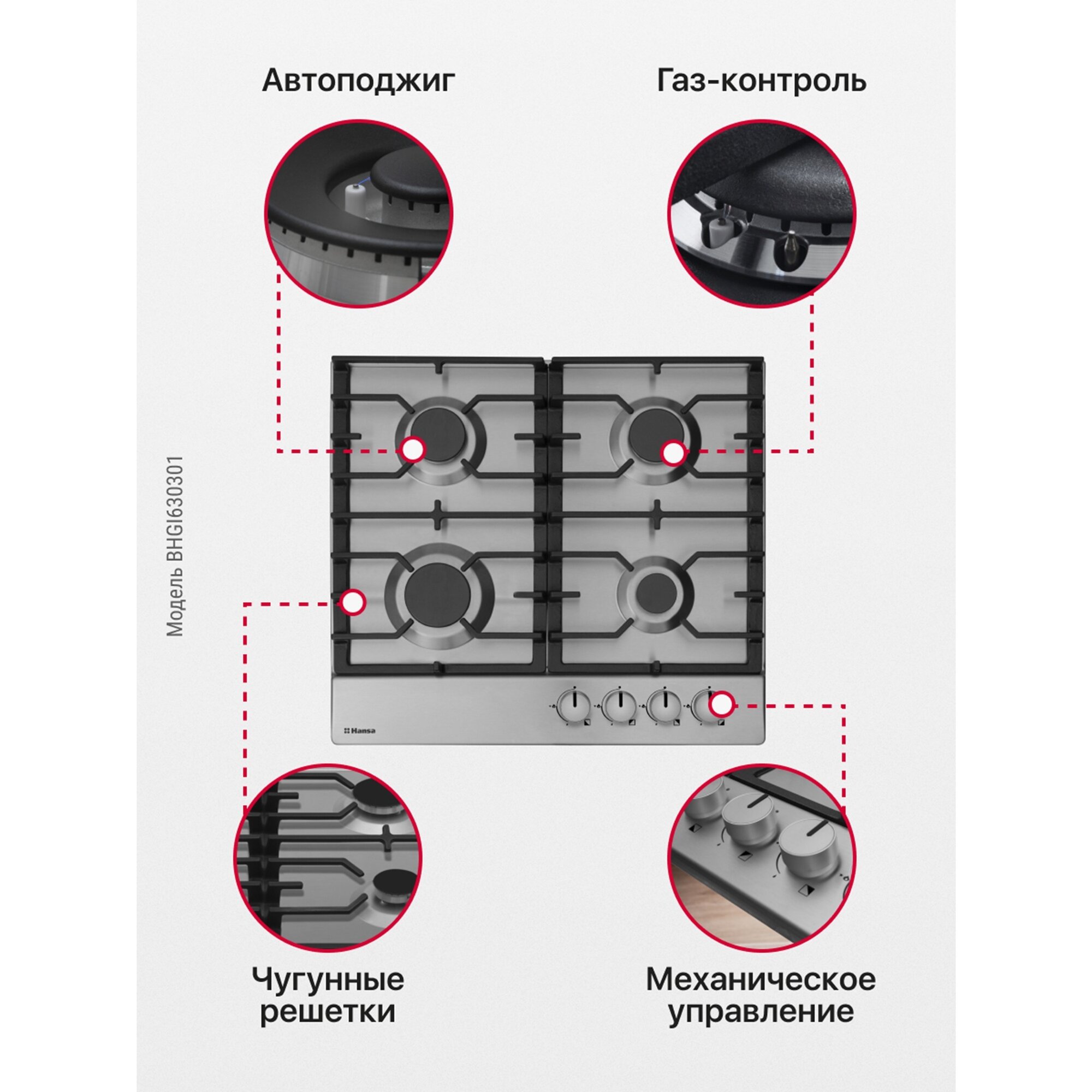 Купить Газовая варочная панель Hansa BHGI630301, встраиваемая, 60 см, газ-контроль и автоподжиг на всех конфорках, чугунные решетки, нержавеющая сталь
