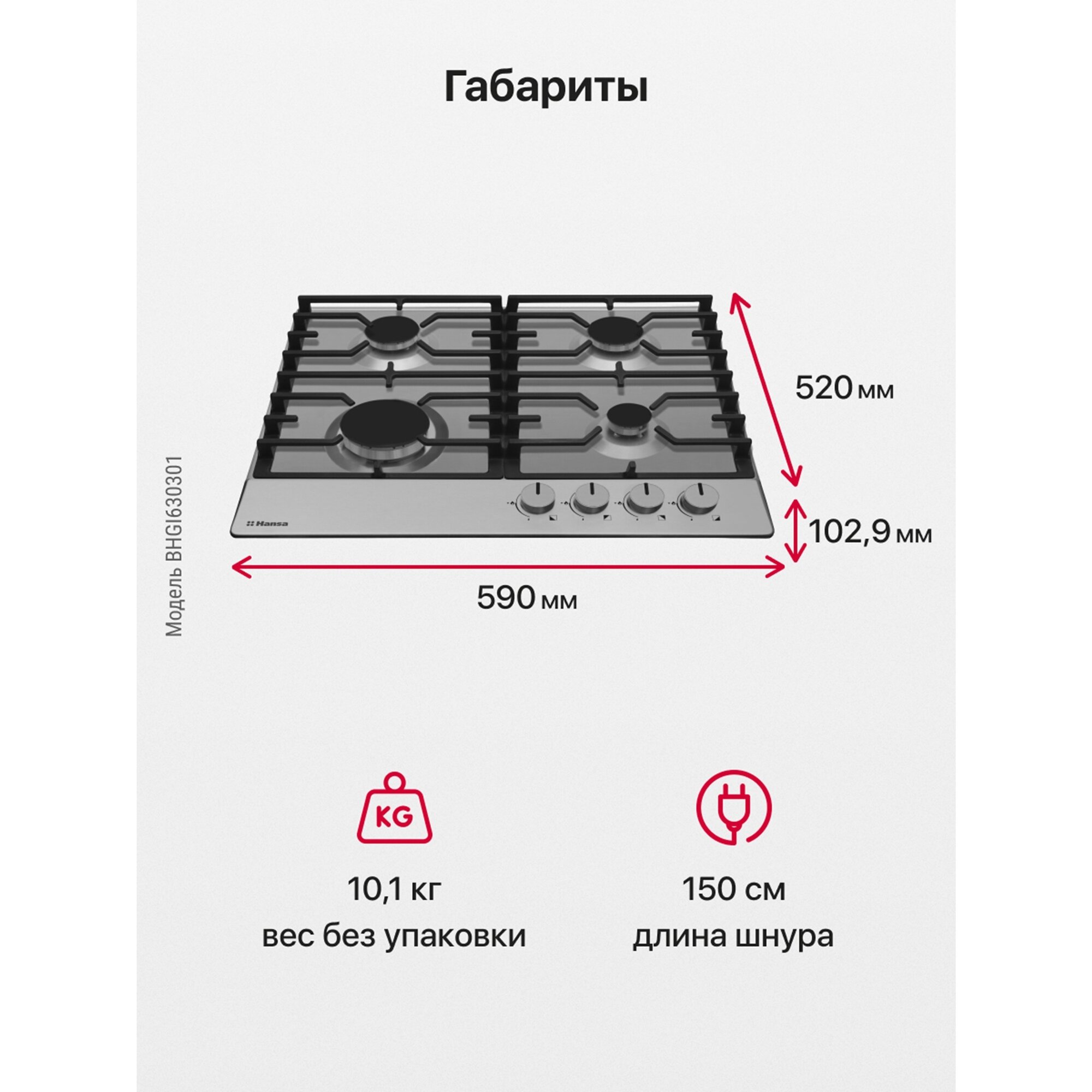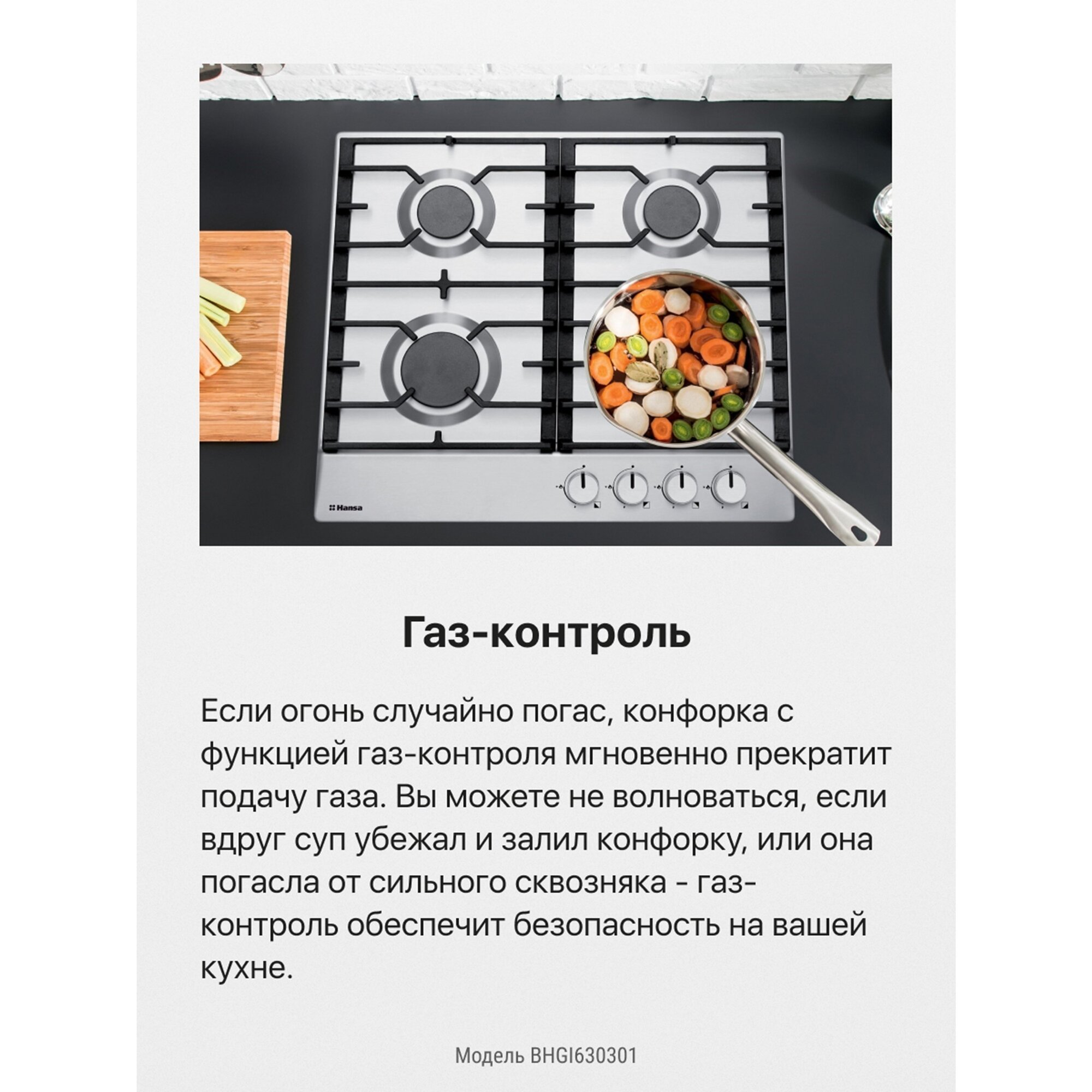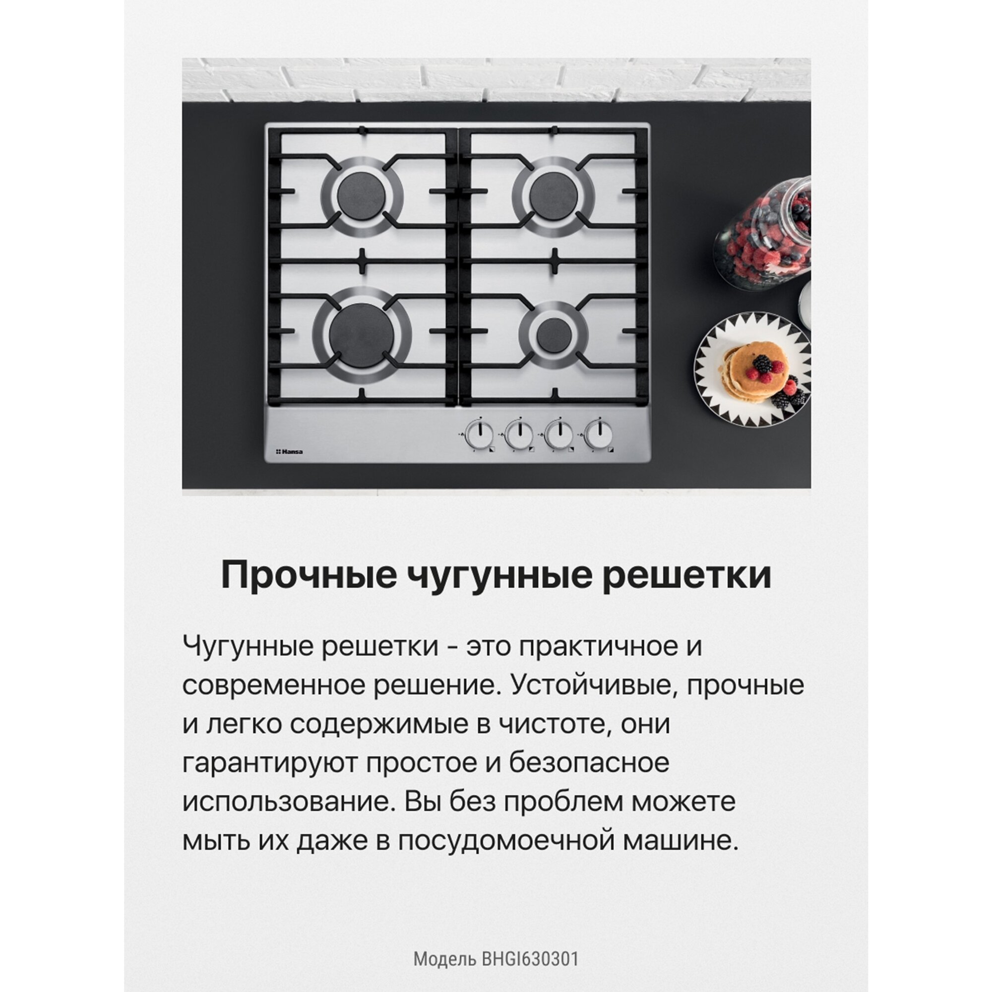 СохранитьГазовая варочная панель Hansa BHGI630301, встраиваемая, 60 см, газ-контроль и автоподжиг на всех конфорках, чугунные решетки, нержавеющая сталь интересное: