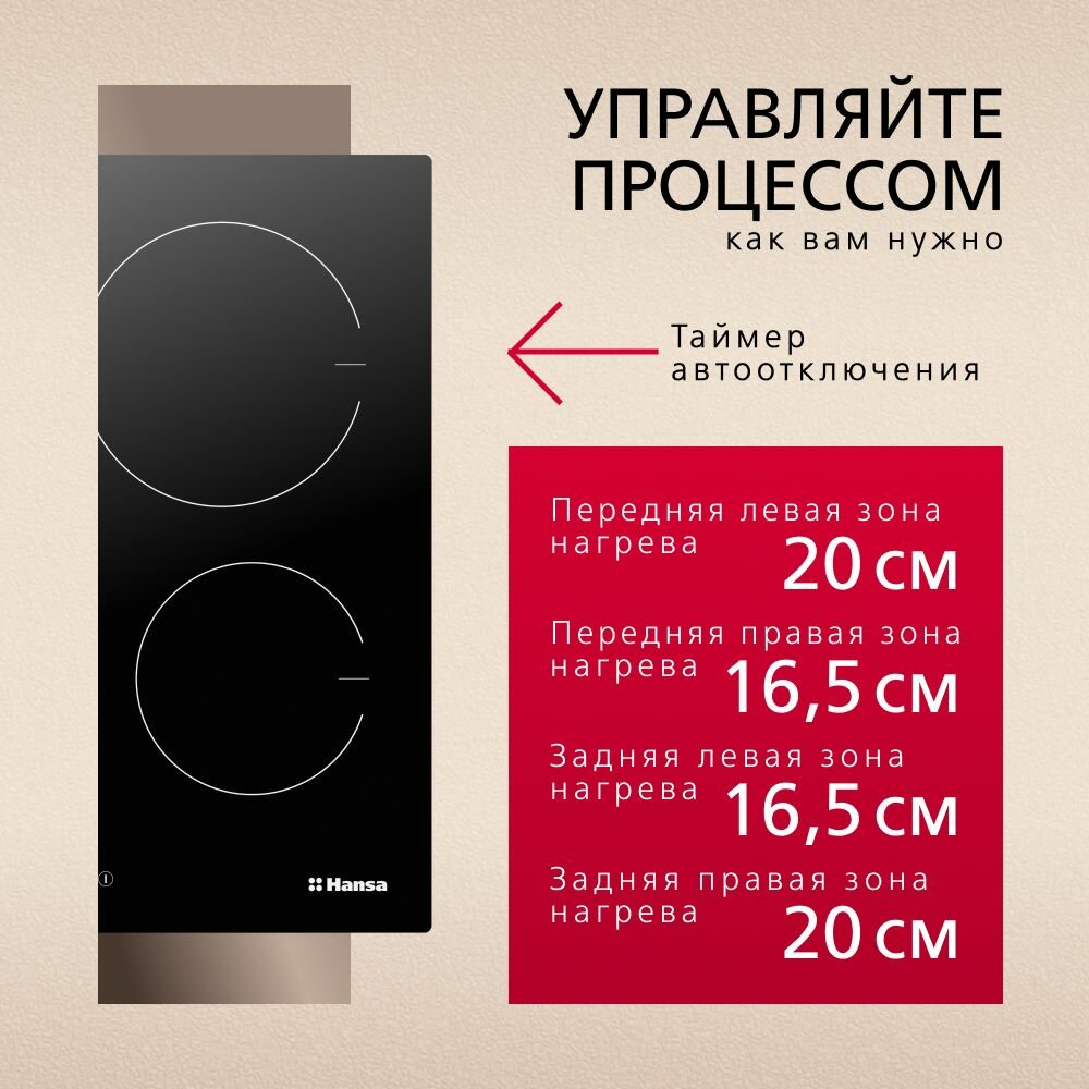 | Размеры конфорок | Передняя левая зона нагрева - 20 см Задняя левая зона нагрева - 16,5 см Передняя правая зона нагрева - 16,5 см Задняя правая зона нагрева - 20 см |
