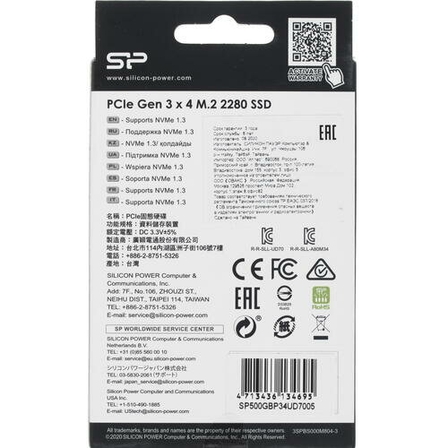 Твердотельный накопитель Silicon Power UD70 SP500GBP34UD7005 SSD, M.2, 500GB, PCI-Ex4, чтение: 3400 Мб/сек, запись: 3000 Мб/сек, 3D NAND, NVMe