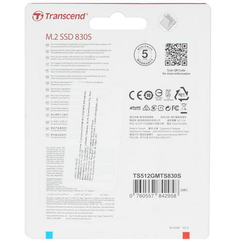 512 ГБ SSD M.2 накопитель Transcend MTS830S (TS512GMTS830S) - SATA 3, чтение - 560 Мбайт/сек, запись - 500 Мбайт/сек, 3D NAND, 3 бит TLC