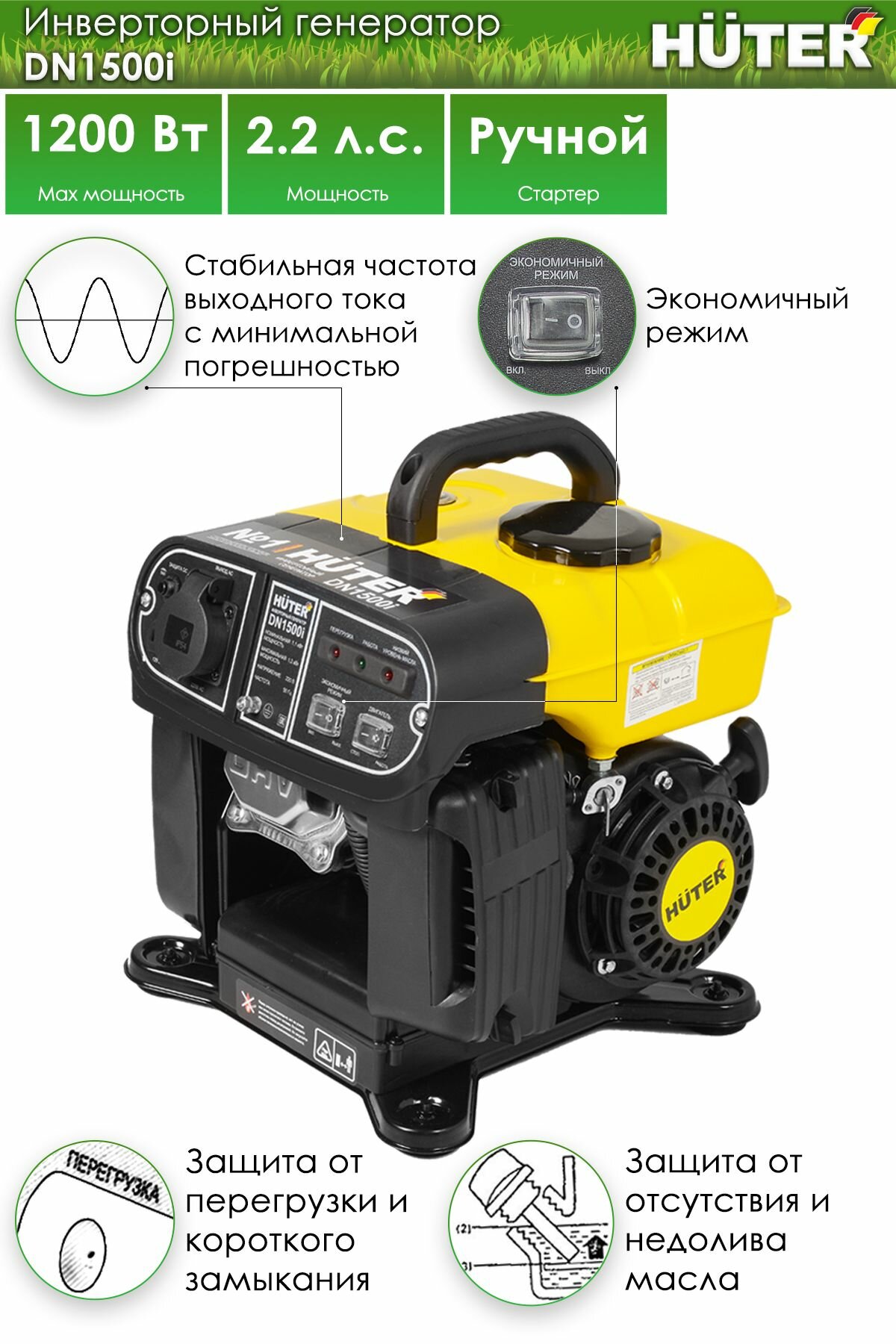 Инверторный генератор DN1500i Huter, 1.1 кВт, одноцилиндровый 4-тактный, бензиновый 64/10/4