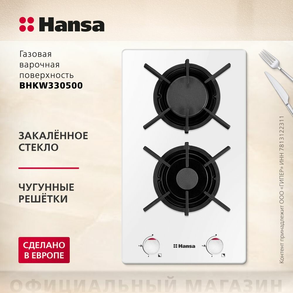 Газовая варочная панель Hansa BHKW330500, двухконфорочная, стеклянная поверхность, с газ-контролем и автоподжигом, белая