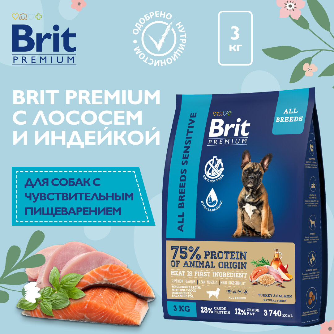 Brit Сухой корм с лососем и индейкой для взрослых собак всех пород с чувствительным пищеварением 5063208 3,000 кг 63213 (1 шт)
