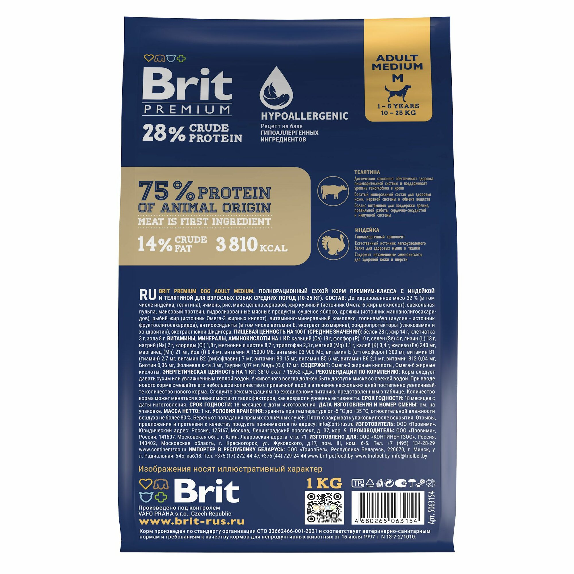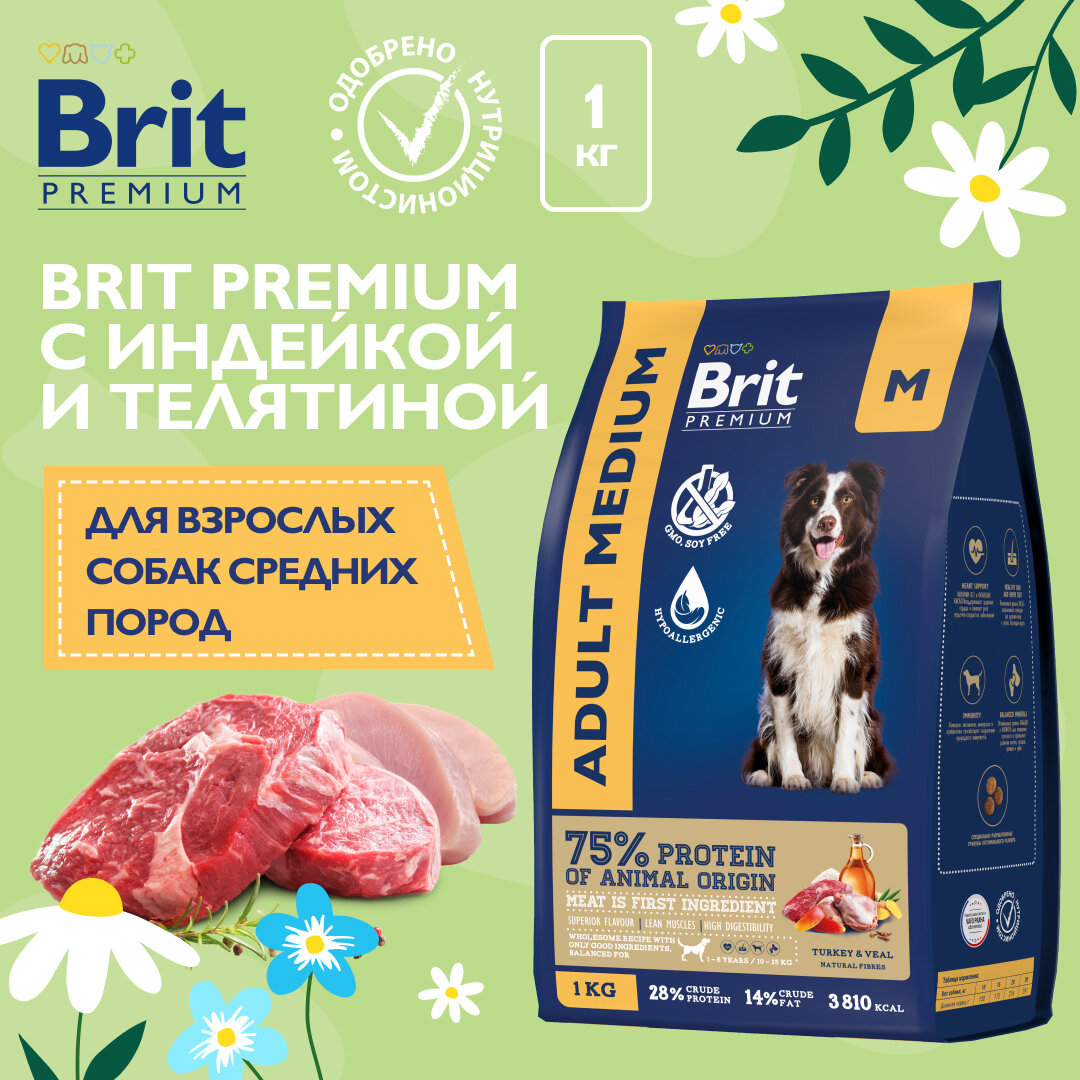 Купить Brit Сухой корм премиум класса с индейкой и телятиной для взрослых собак средних пород 10–25кг, 1кг