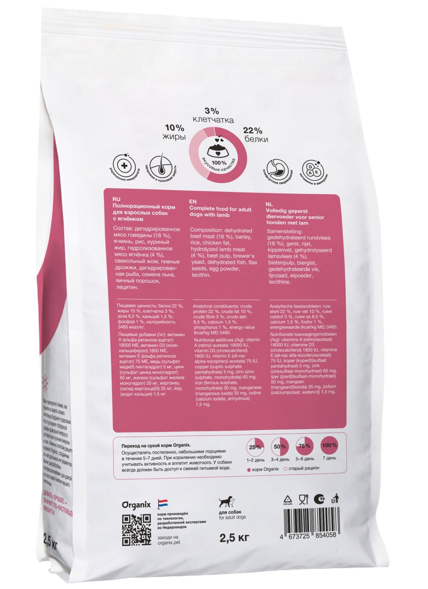 | Состав | дегидрированное мясо ягненка (12%), ячмень, рис, дегидрированное мясо курицы, куриный жир, свекольный жом, пивные дрожжи, дегидрированная рыба, семена льна, яичный порошок, лецитин |