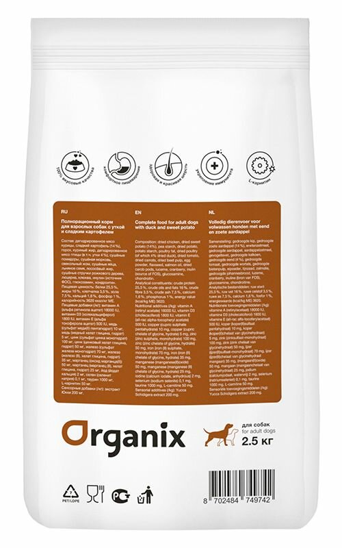 Organix сухой корм для взрослых собак, с уткой и сладким картофелем, 2,5кг